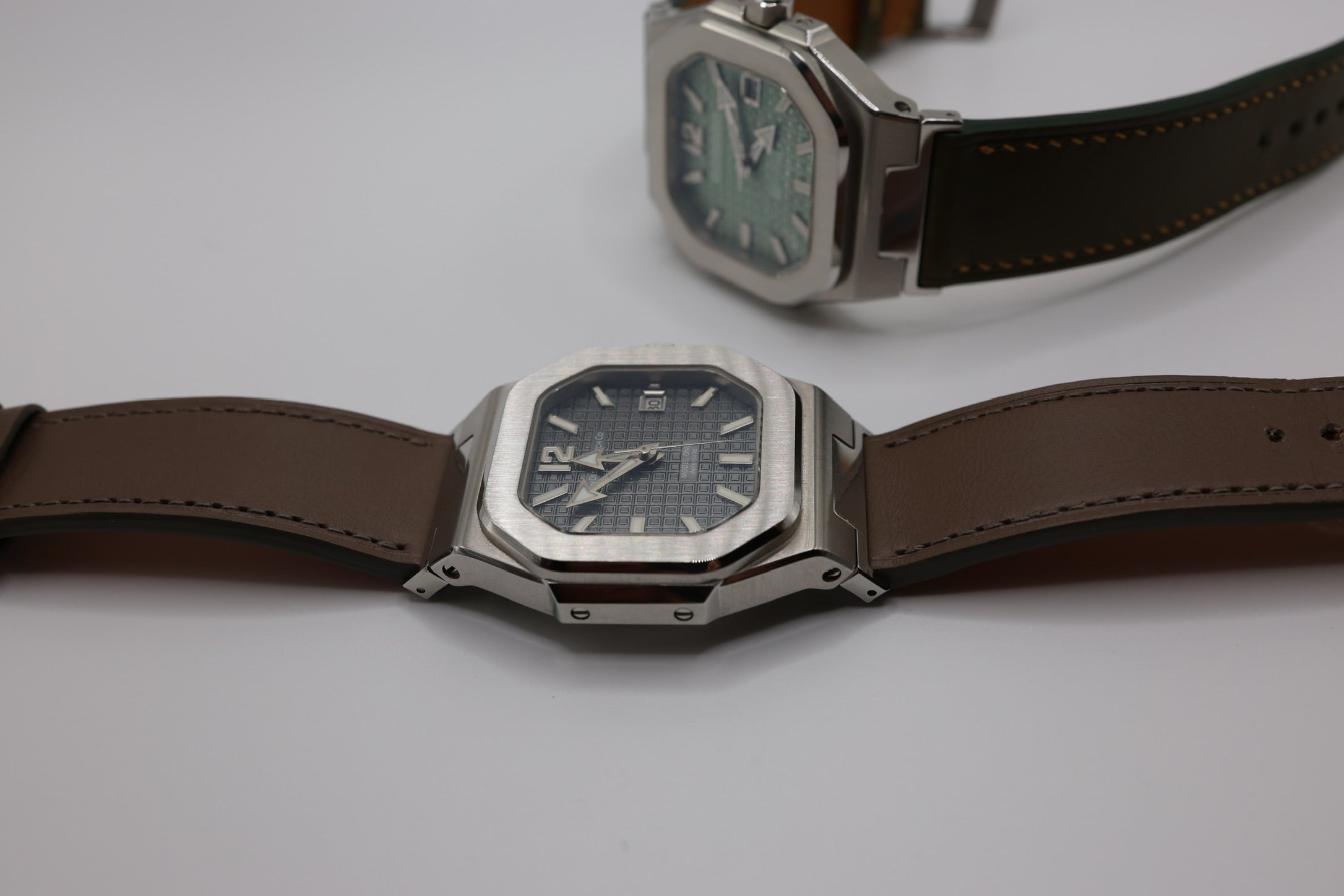 The dial showcases a brick-like tapisserie pattern. This pattern combining with the metallic paint and the thick applied indices makes the watch extremely playful with light, while maintaining legibility. You can read Time & Tide article on Model One's dial here