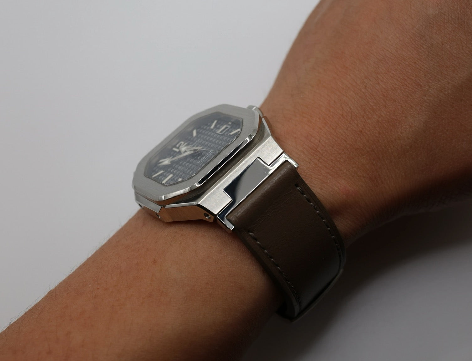 We believe our watch is the very first integrated bracelet watch with a square case shape. Its case shape is what we called "beveled square". We soften the edges of the square to ensure aesthetic quality and reduce the watch's overall foot print