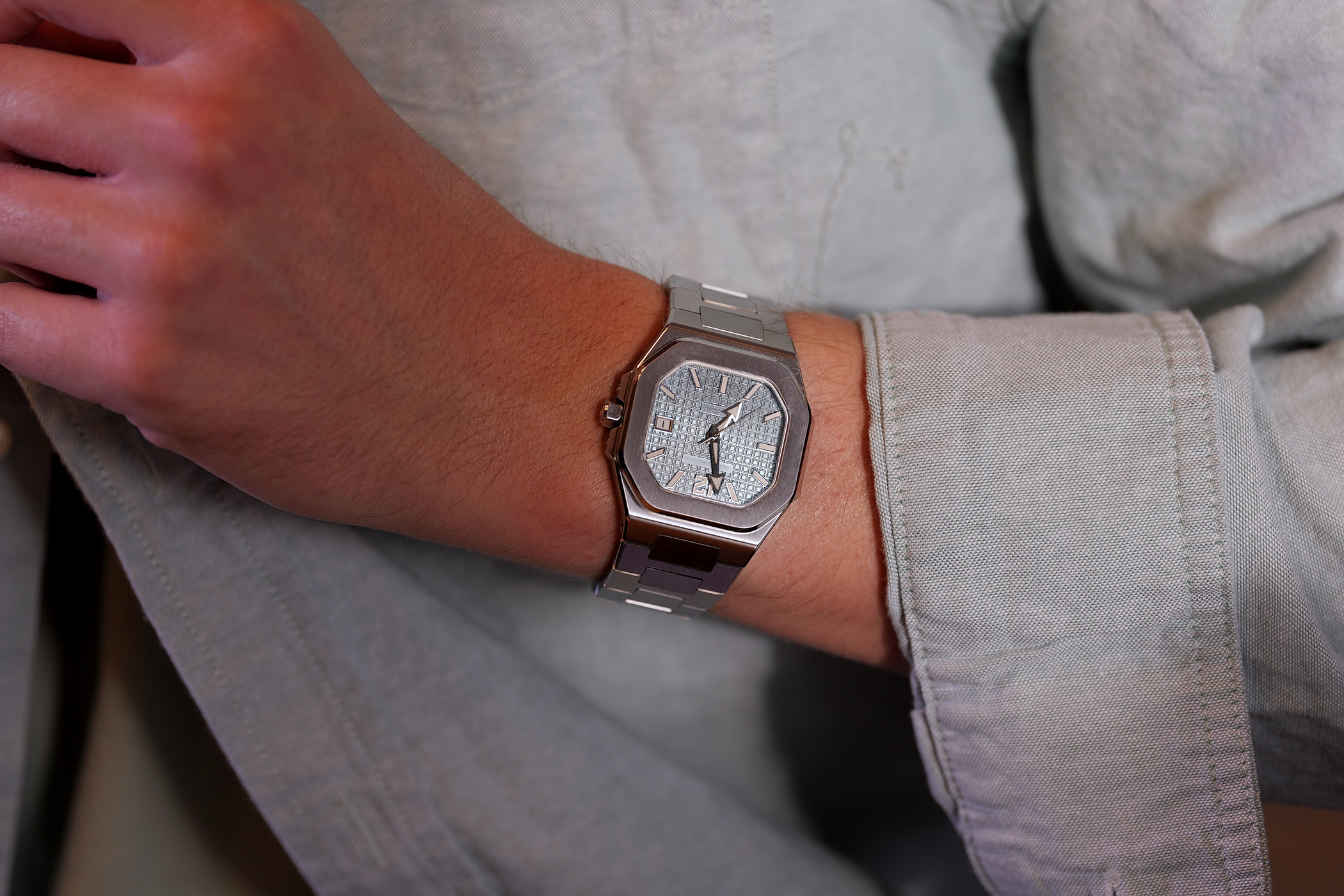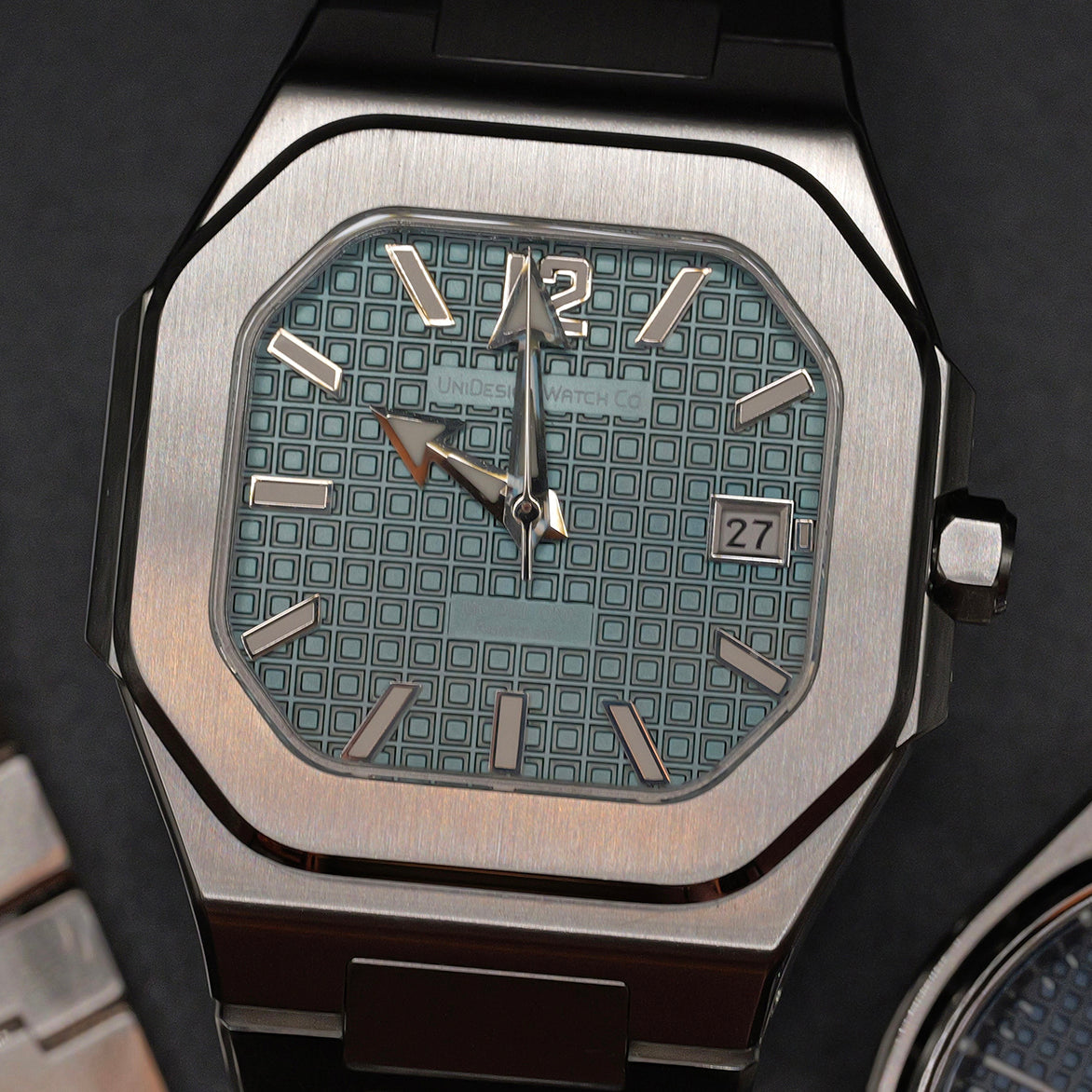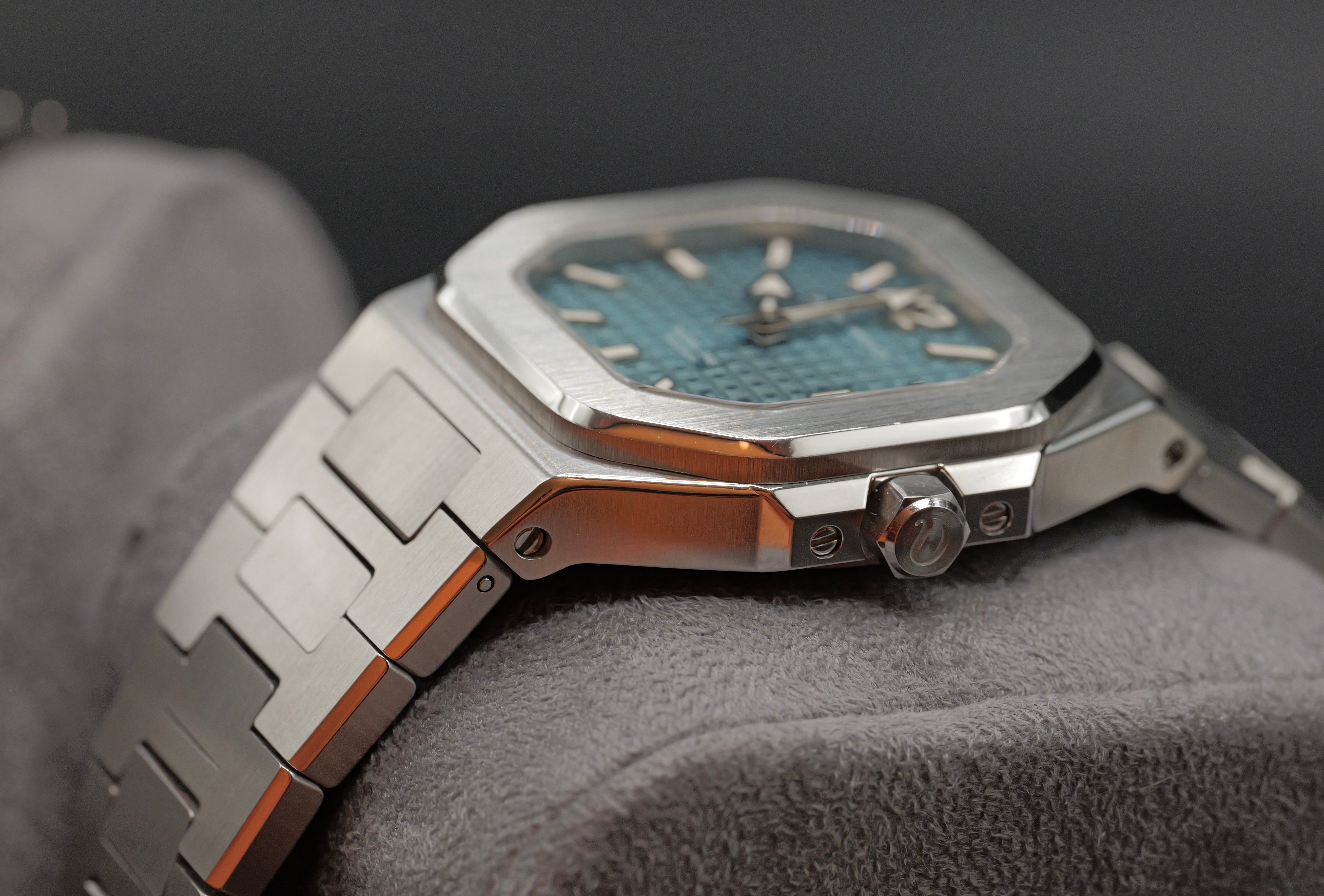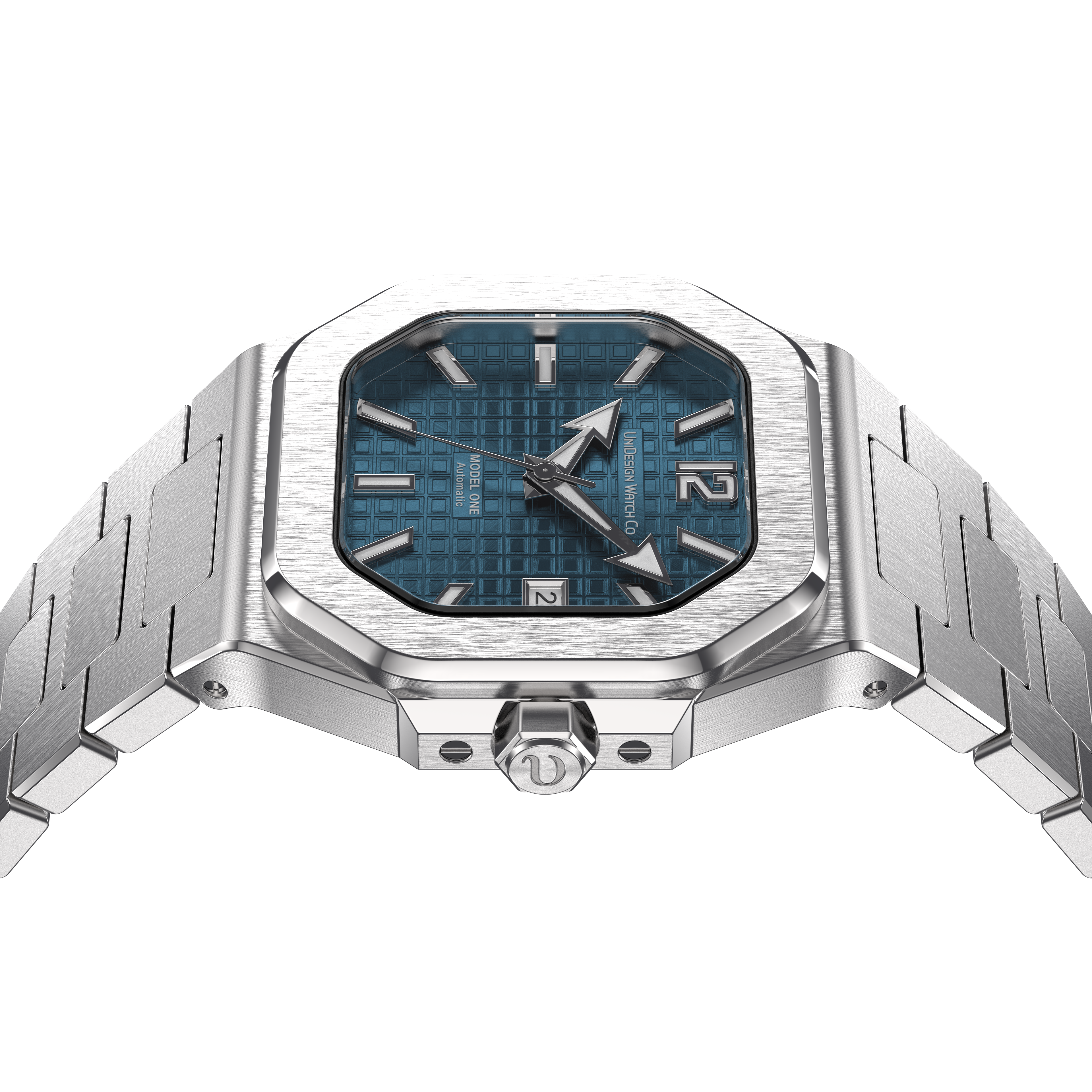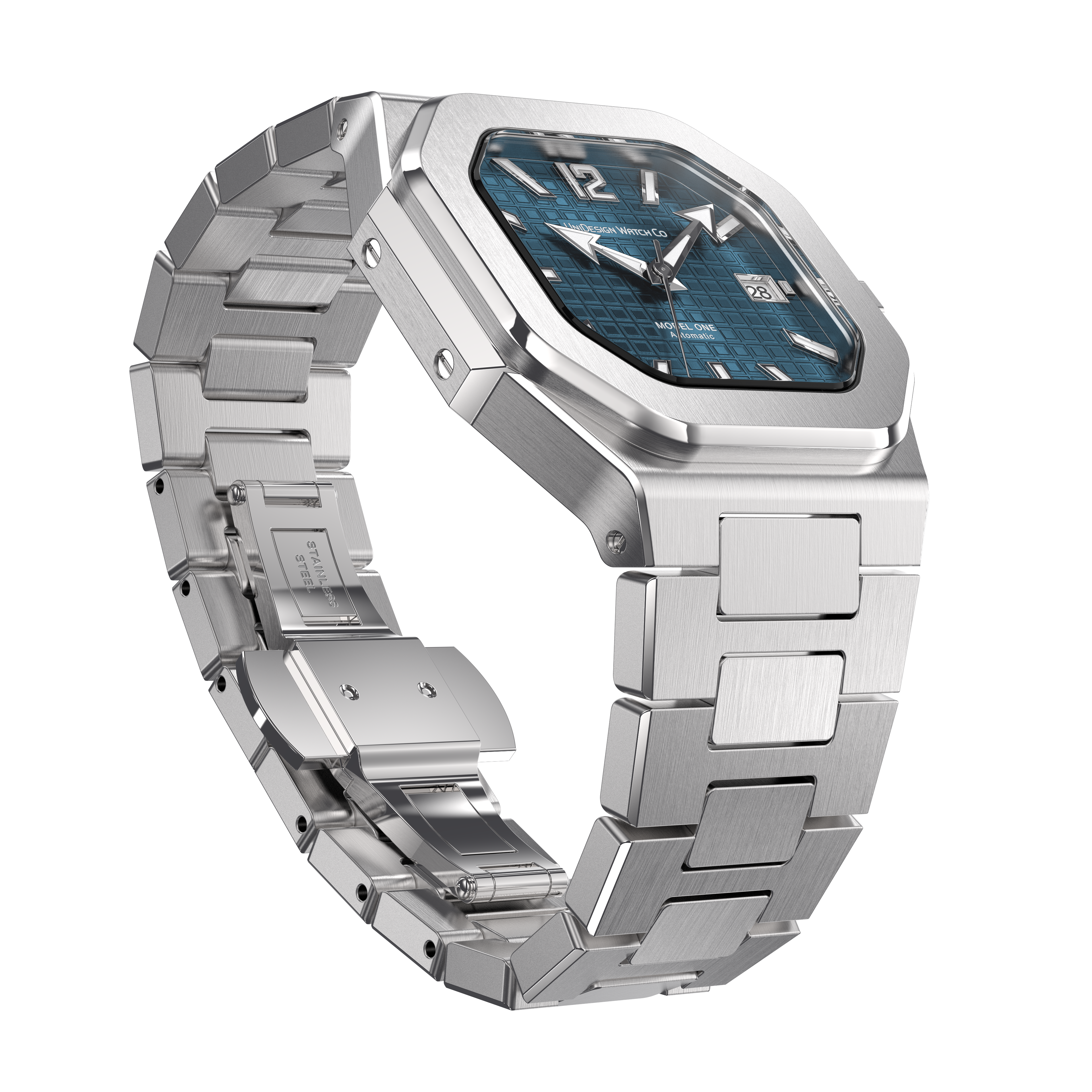 We believe our watch is the very first integrated bracelet watch with a square case shape. Its case shape is what we called "beveled square". We soften the edges of the square to ensure aesthetic quality and reduce the watch's overall foot print