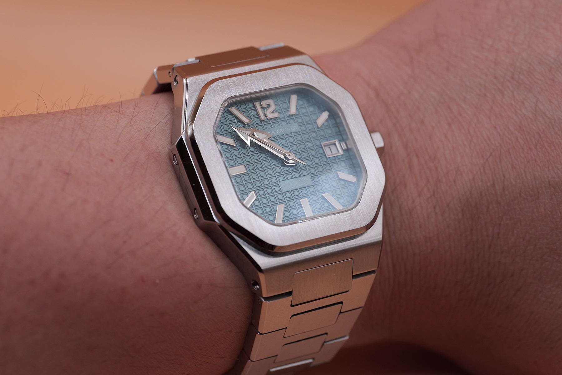 The dial showcases a brick-like tapisserie pattern. This pattern combining with the metallic paint and the thick applied indices makes the watch extremely playful with light, while maintaining legibility. You can read Time & Tide article on Model One's dial here