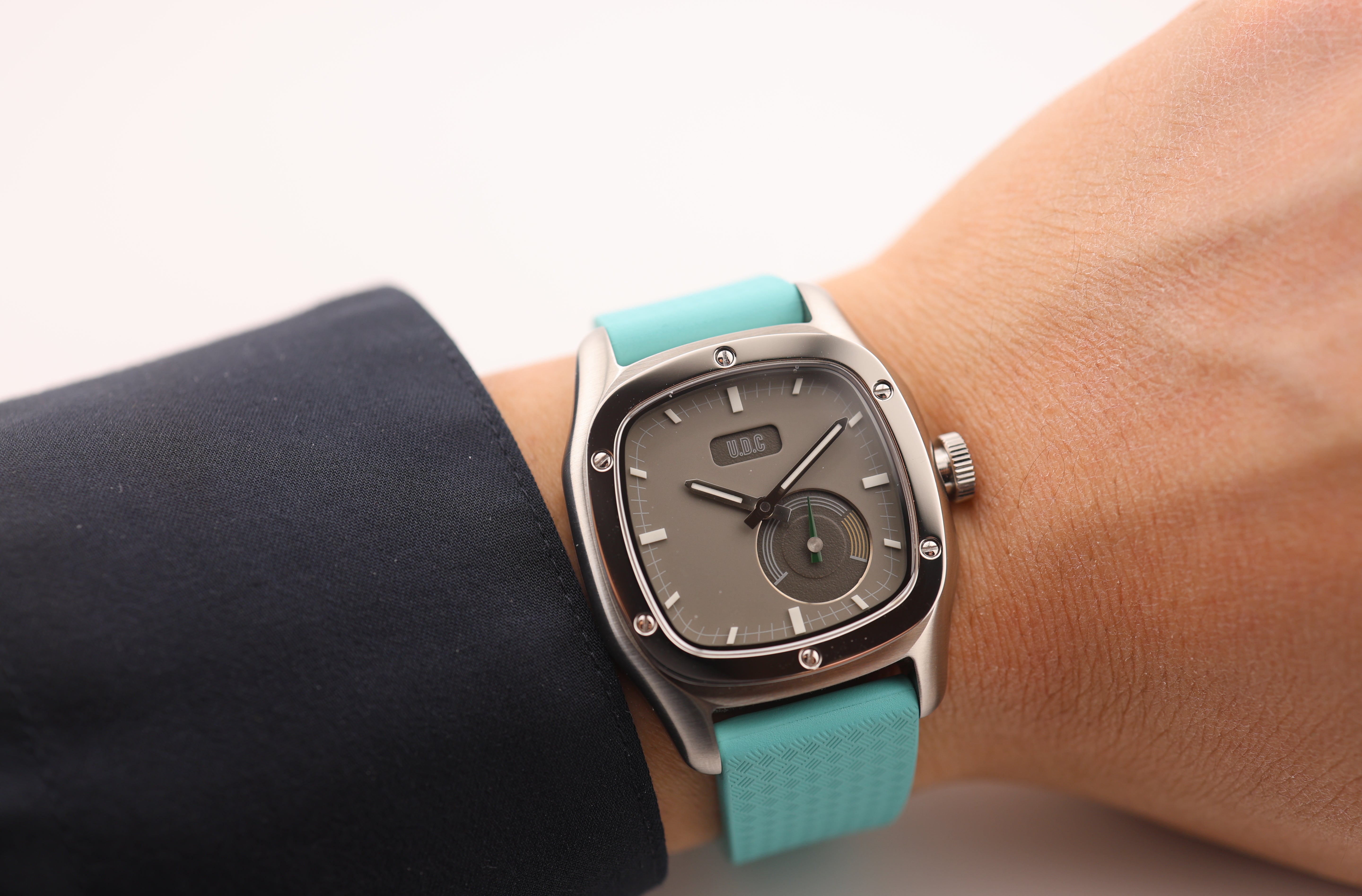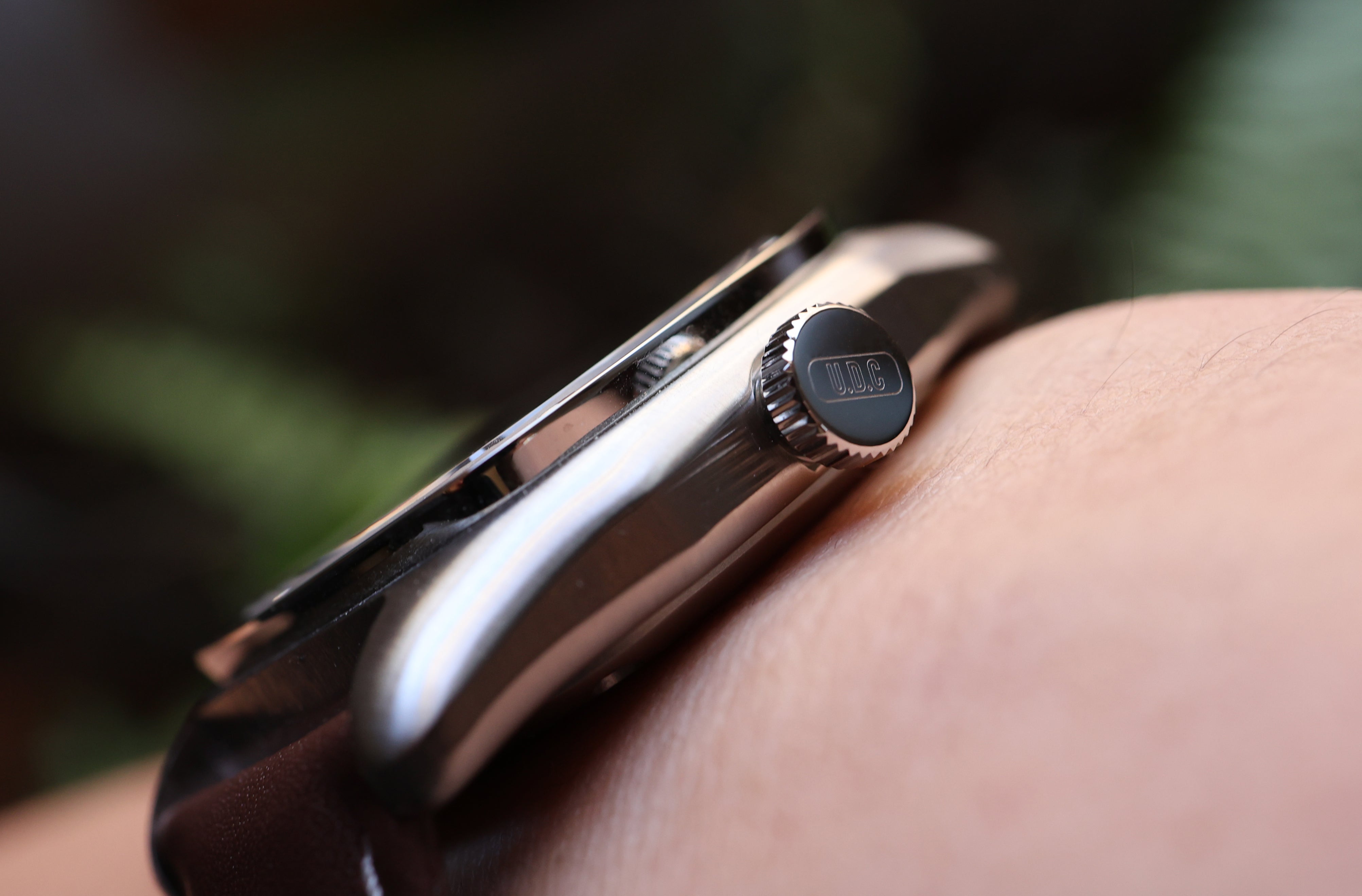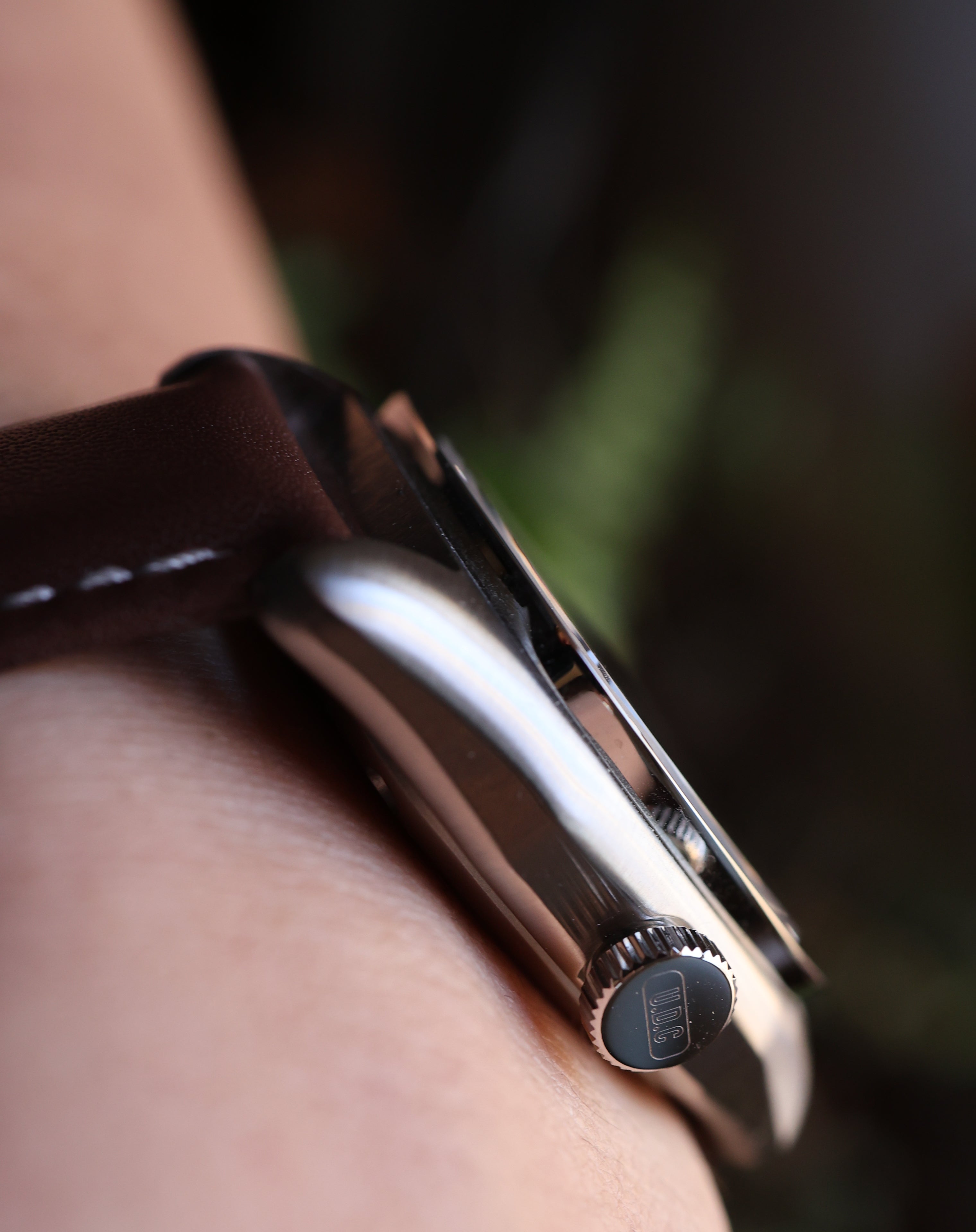 Designed to resemble a car wheel, the crown is slightly larger and slimmer than a typical crown and connects to the case with a "tube". The crown is both aesthetically pleasing and extremely easy to grab. The crown is tightened to the case by screwing down, a feature often found in high-end watches to ensure high water resistance level.