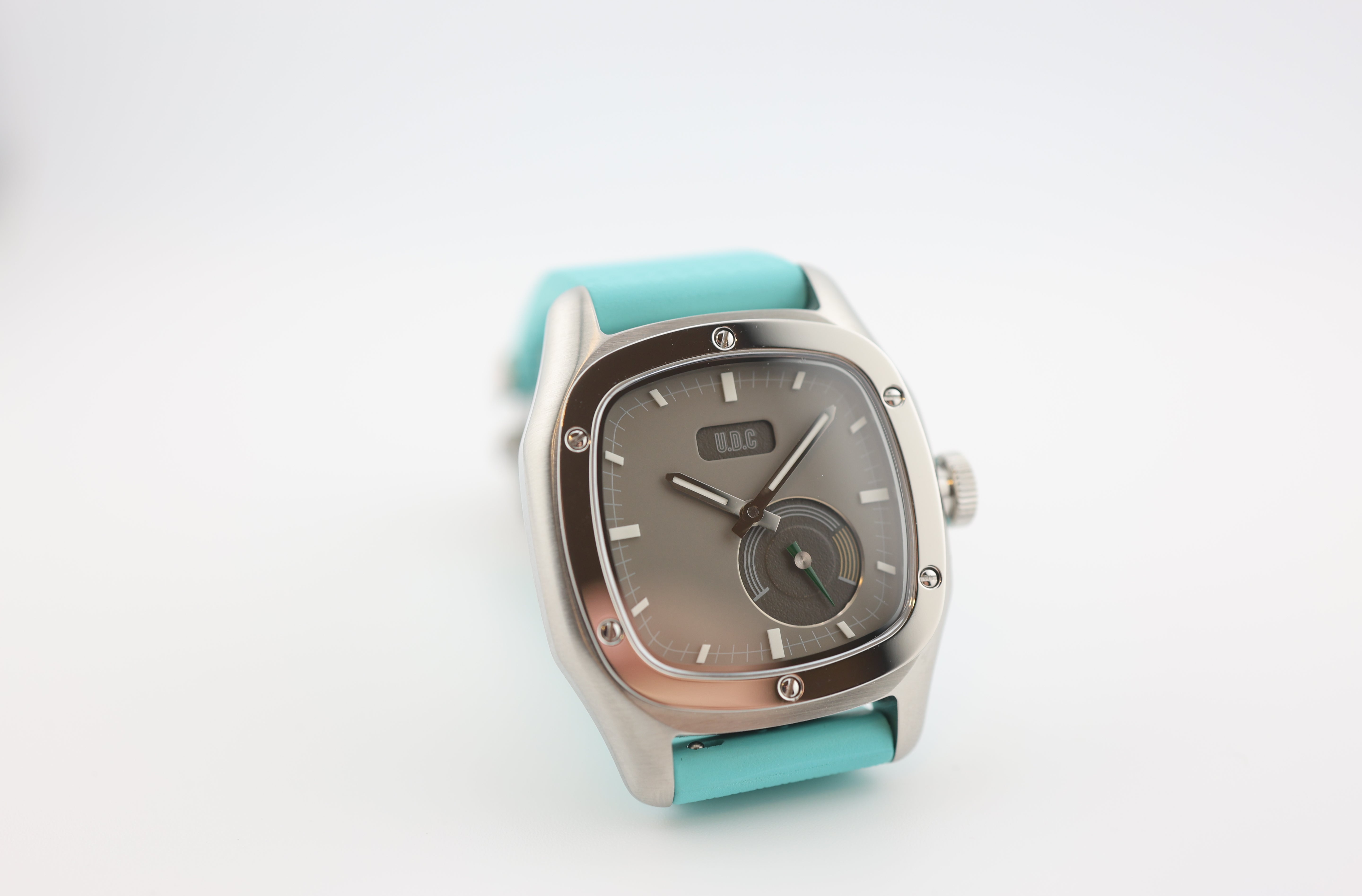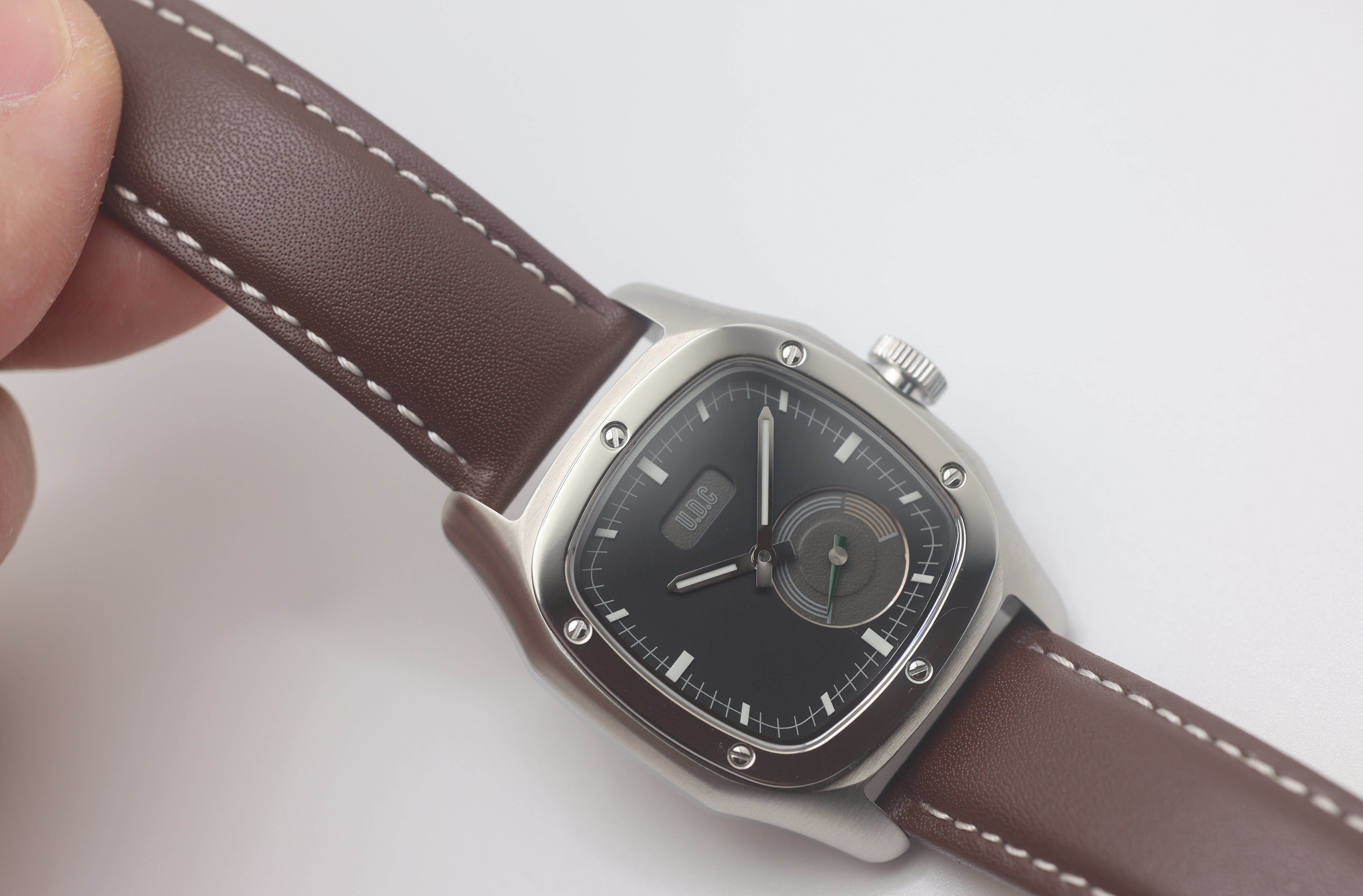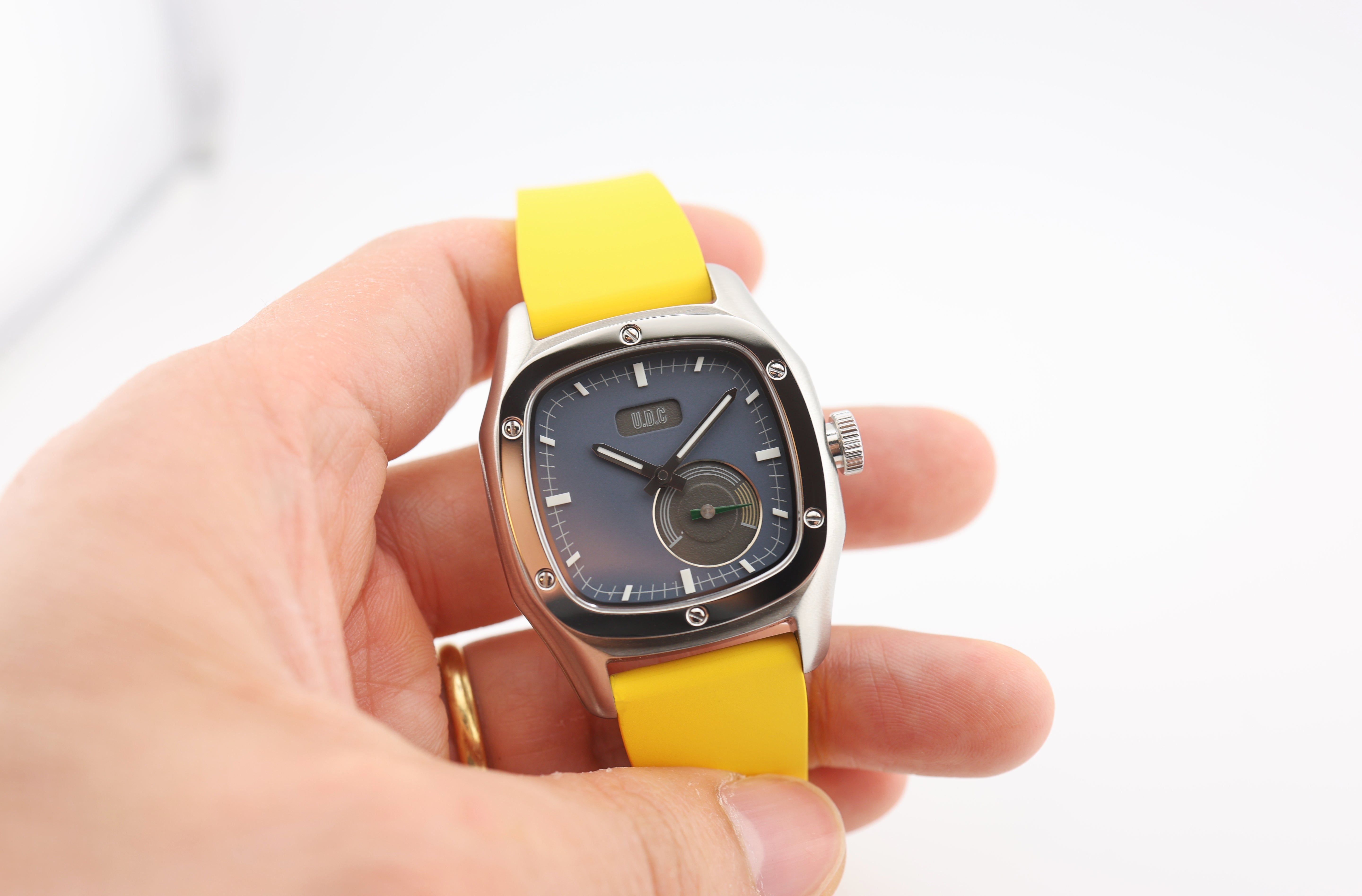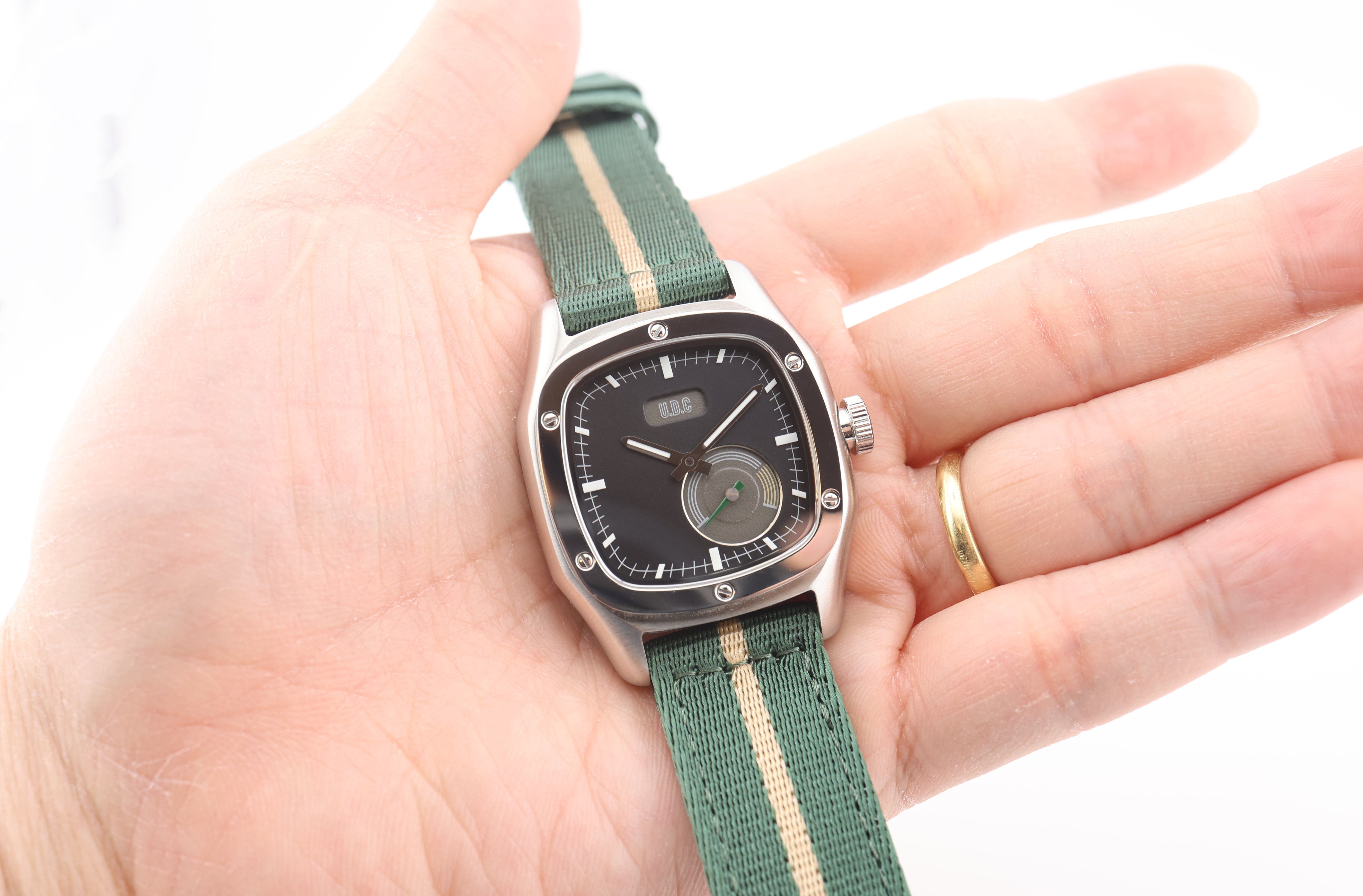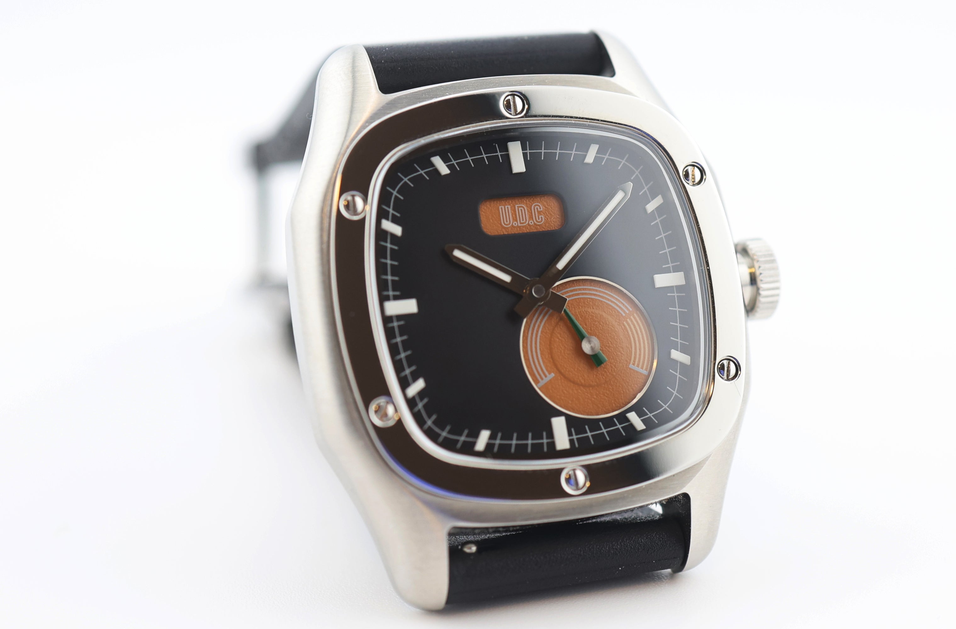 Our watch features a small sub-dial with running second hands. We specifically designed the watch with the sub-dial to resemble a classic car cluster with all their gauges. The small second sub-dial is modeled after a tachometer with a green running hand and yellow "high RPM" range.