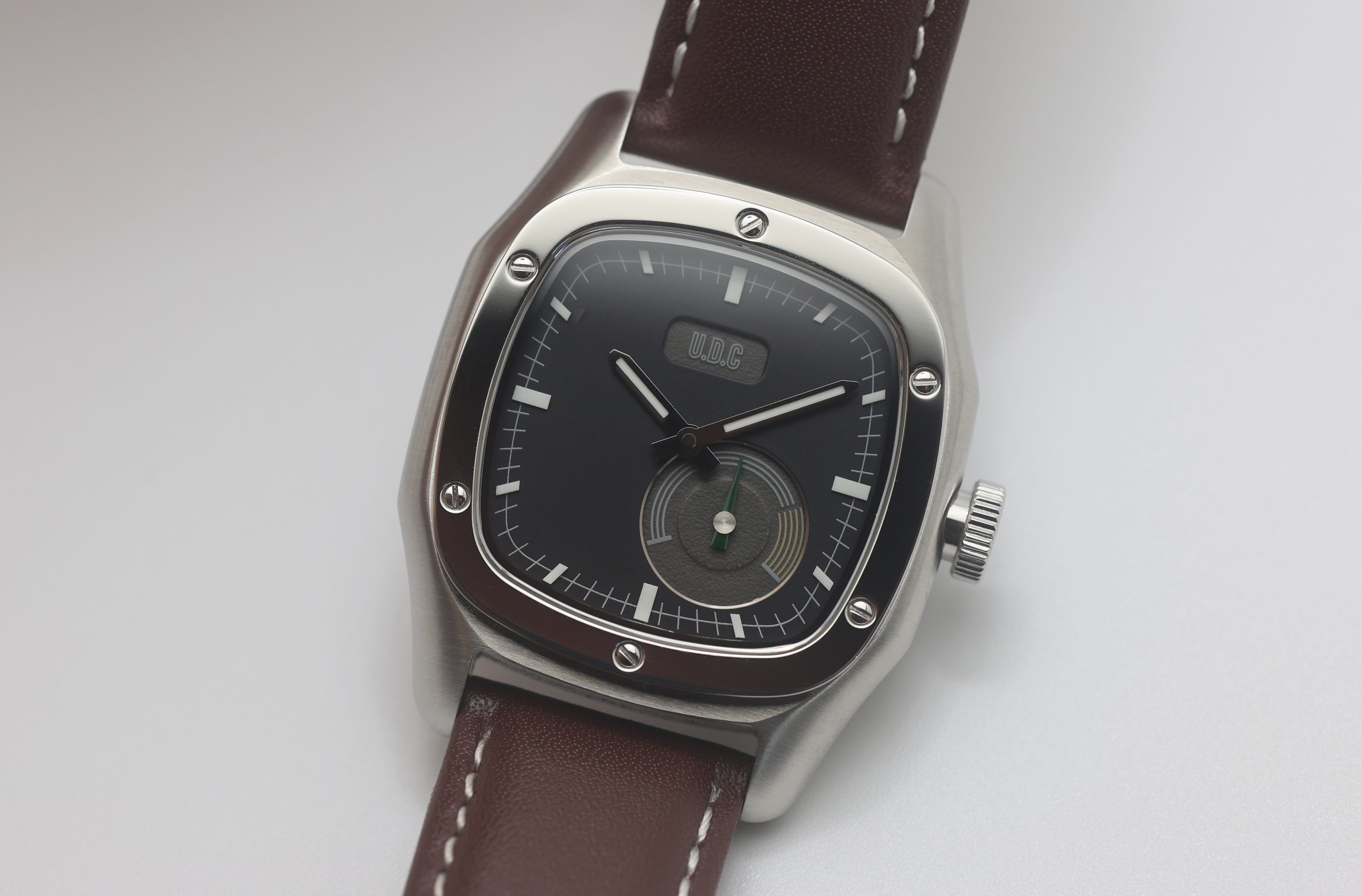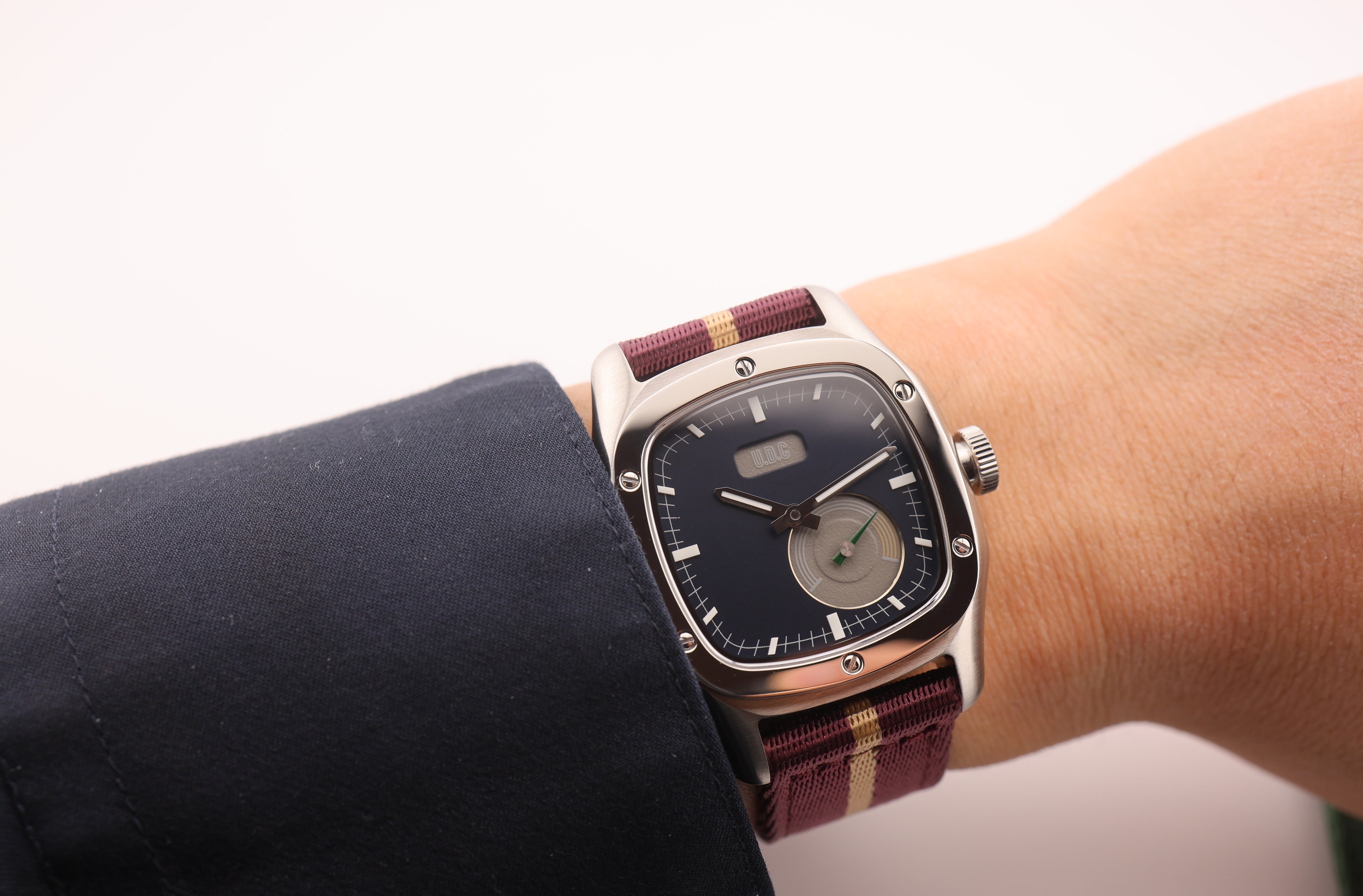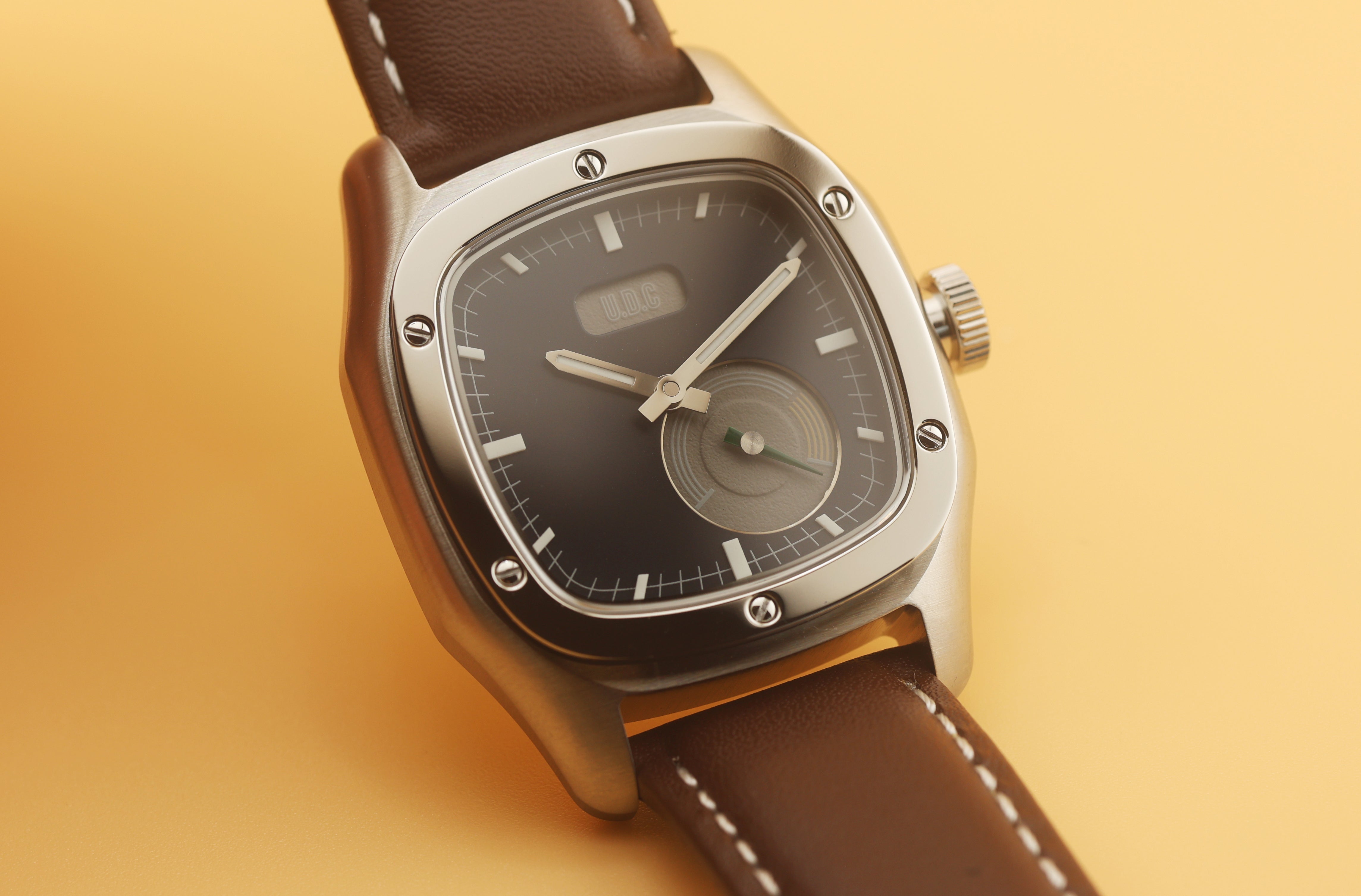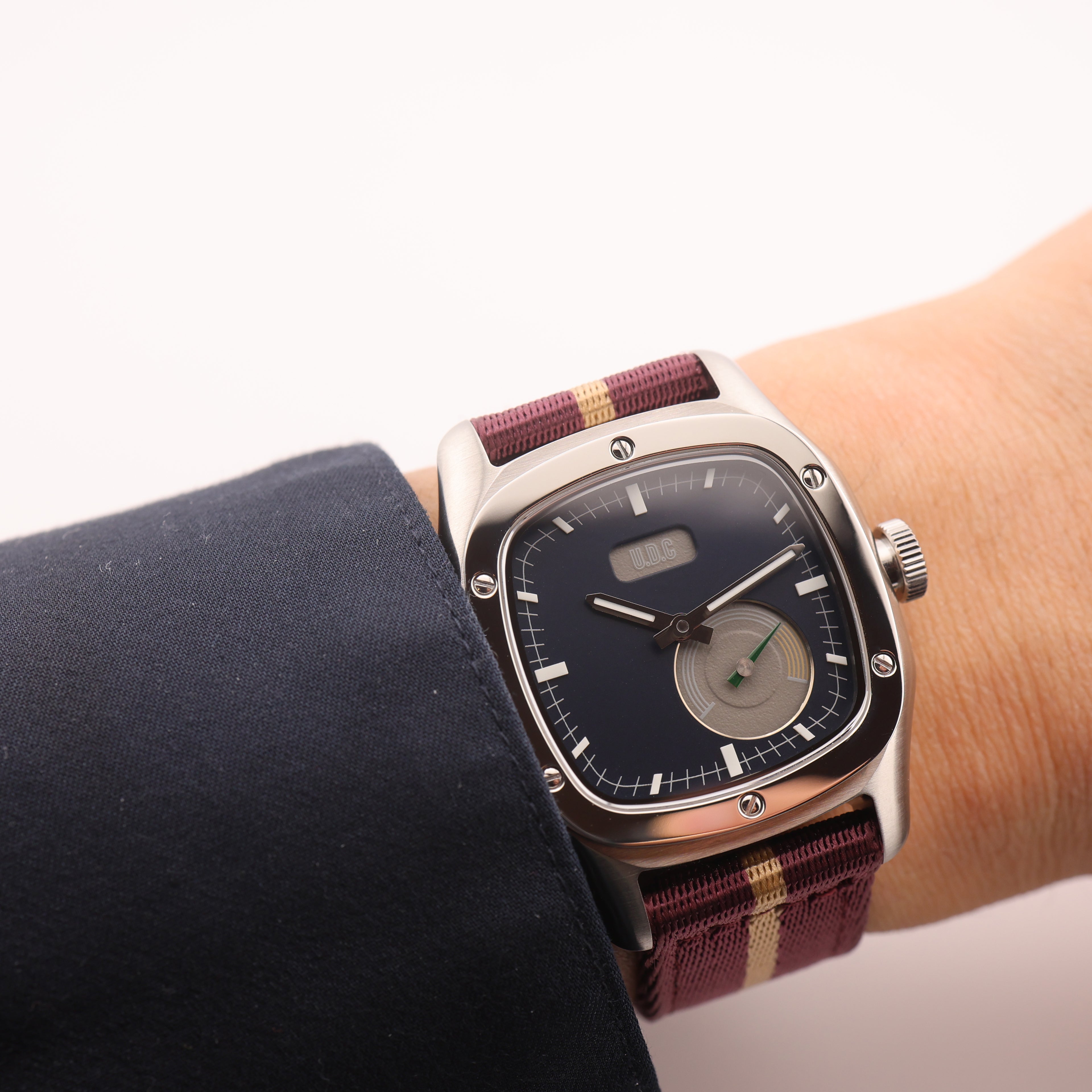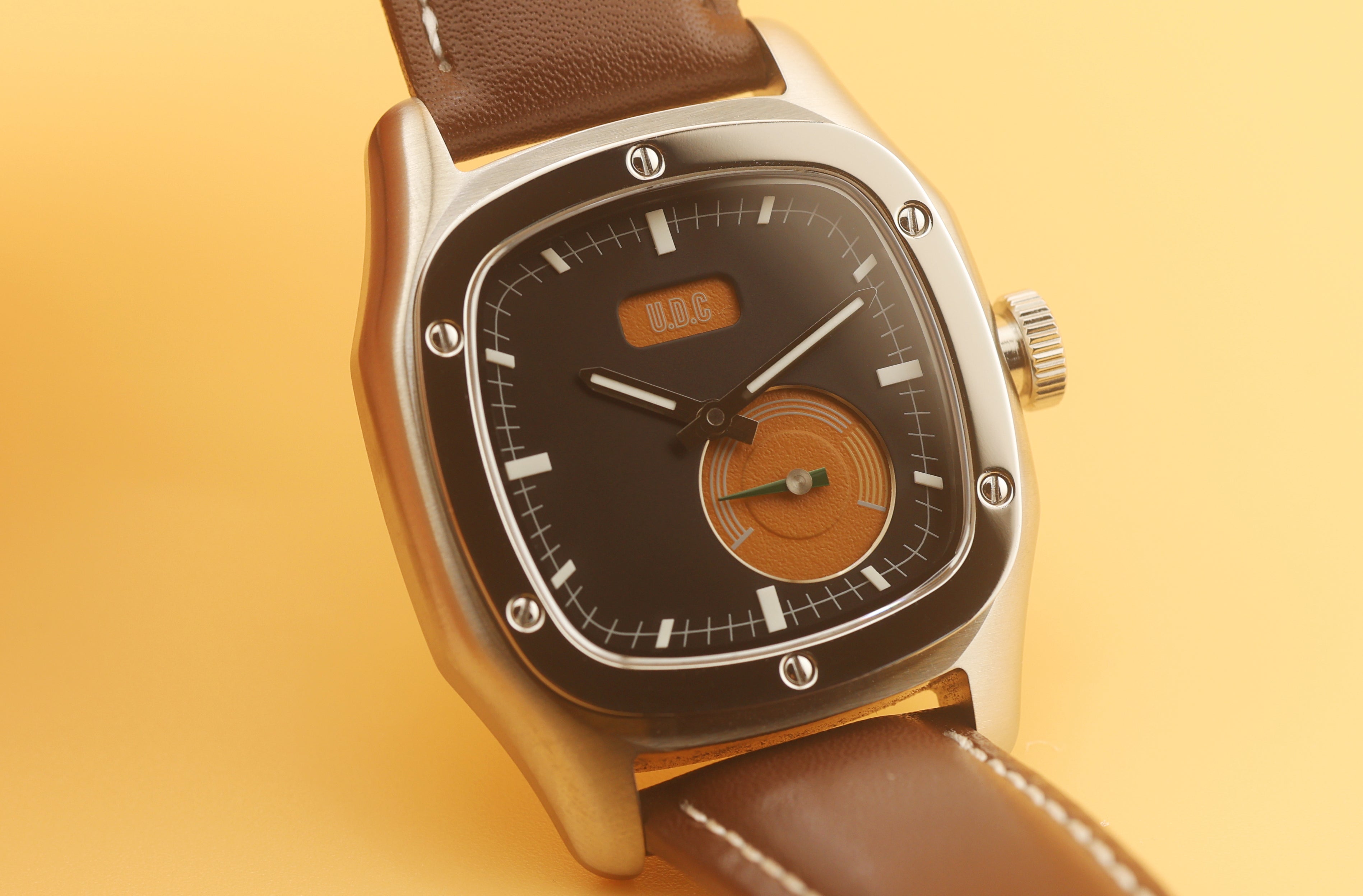 Our watch features a small sub-dial with running second hands. We specifically designed the watch with the sub-dial to resemble a classic car cluster with all their gauges. The small second sub-dial is modeled after a tachometer with a green running hand and yellow "high RPM" range.