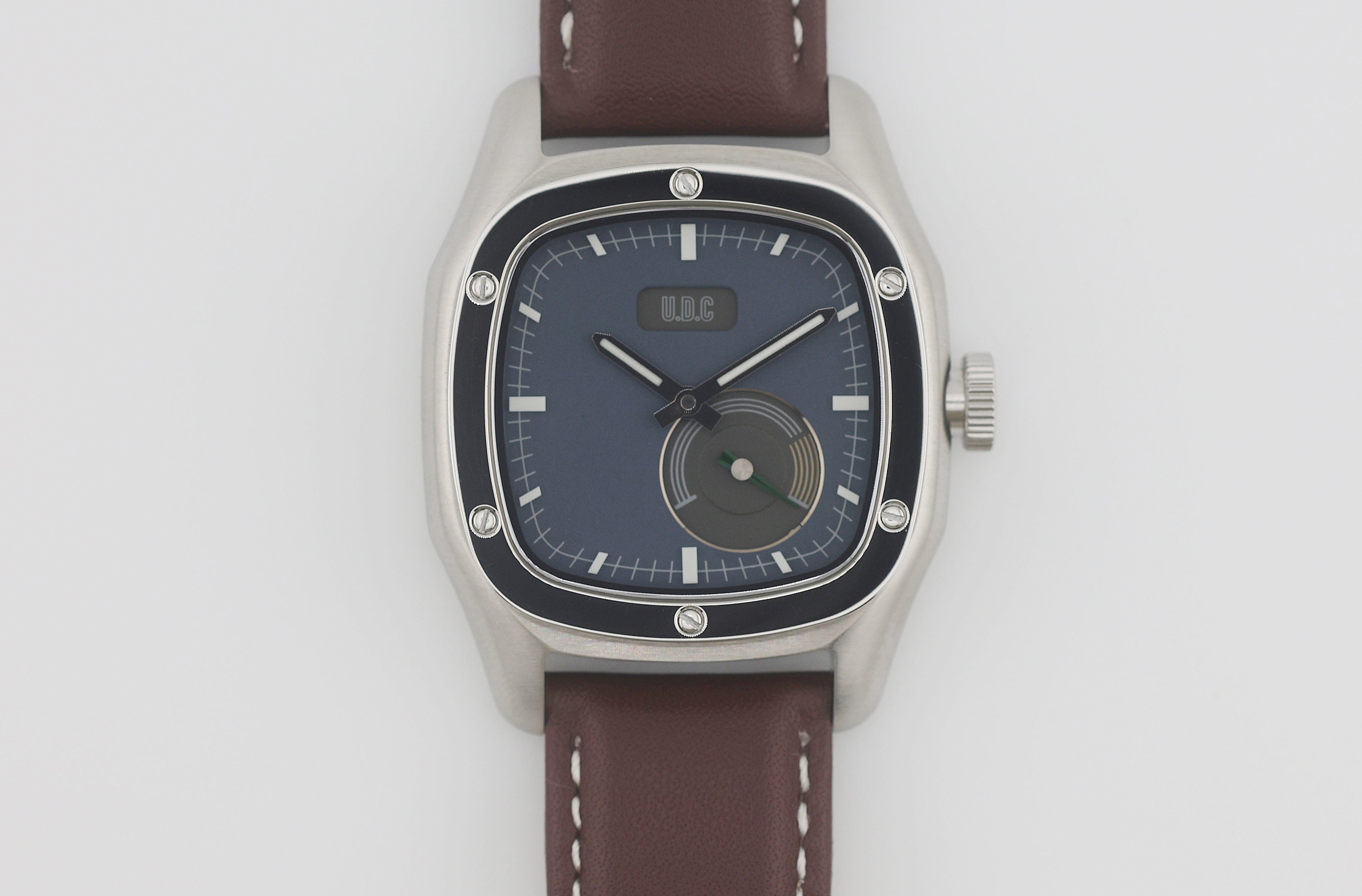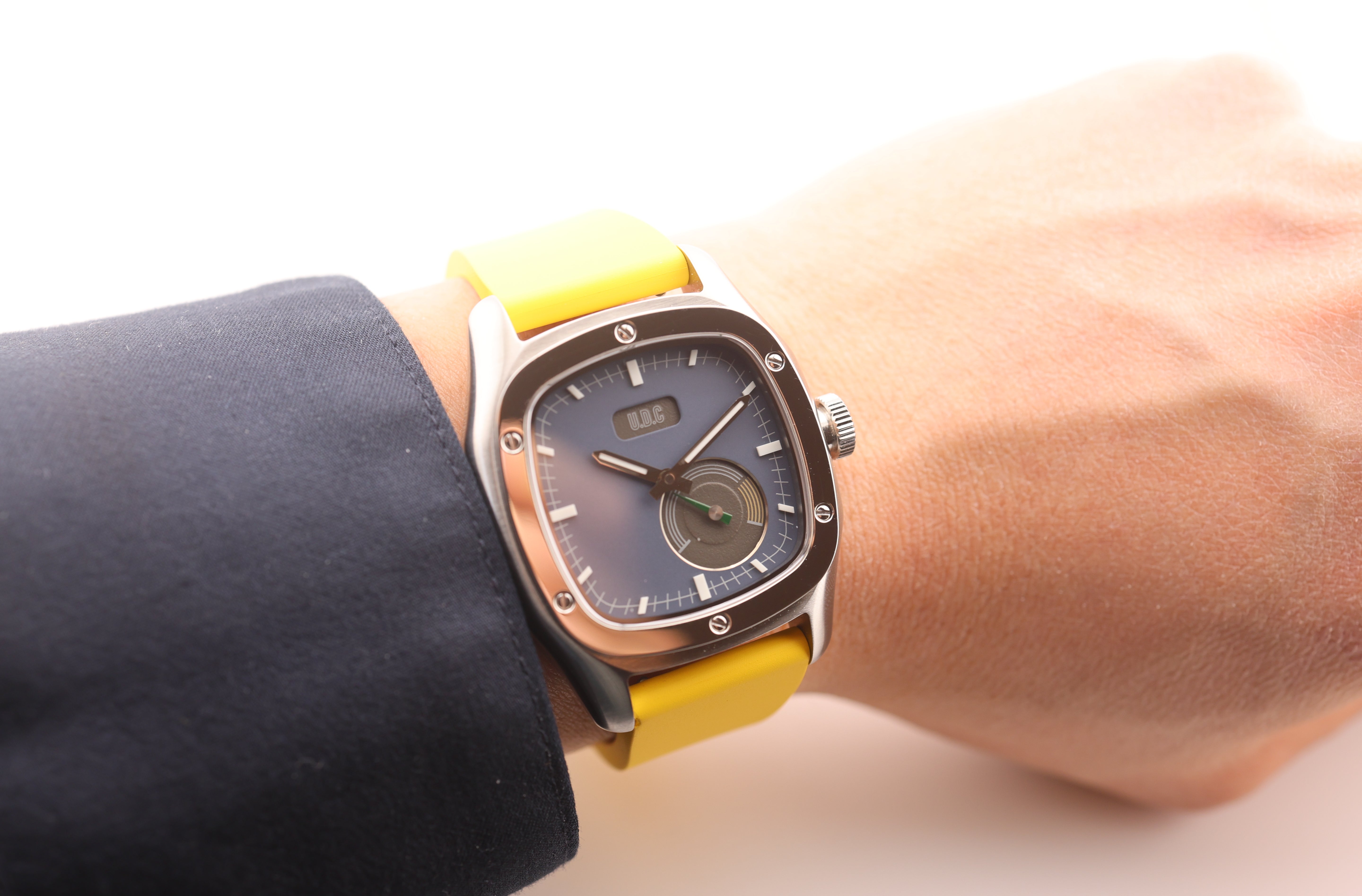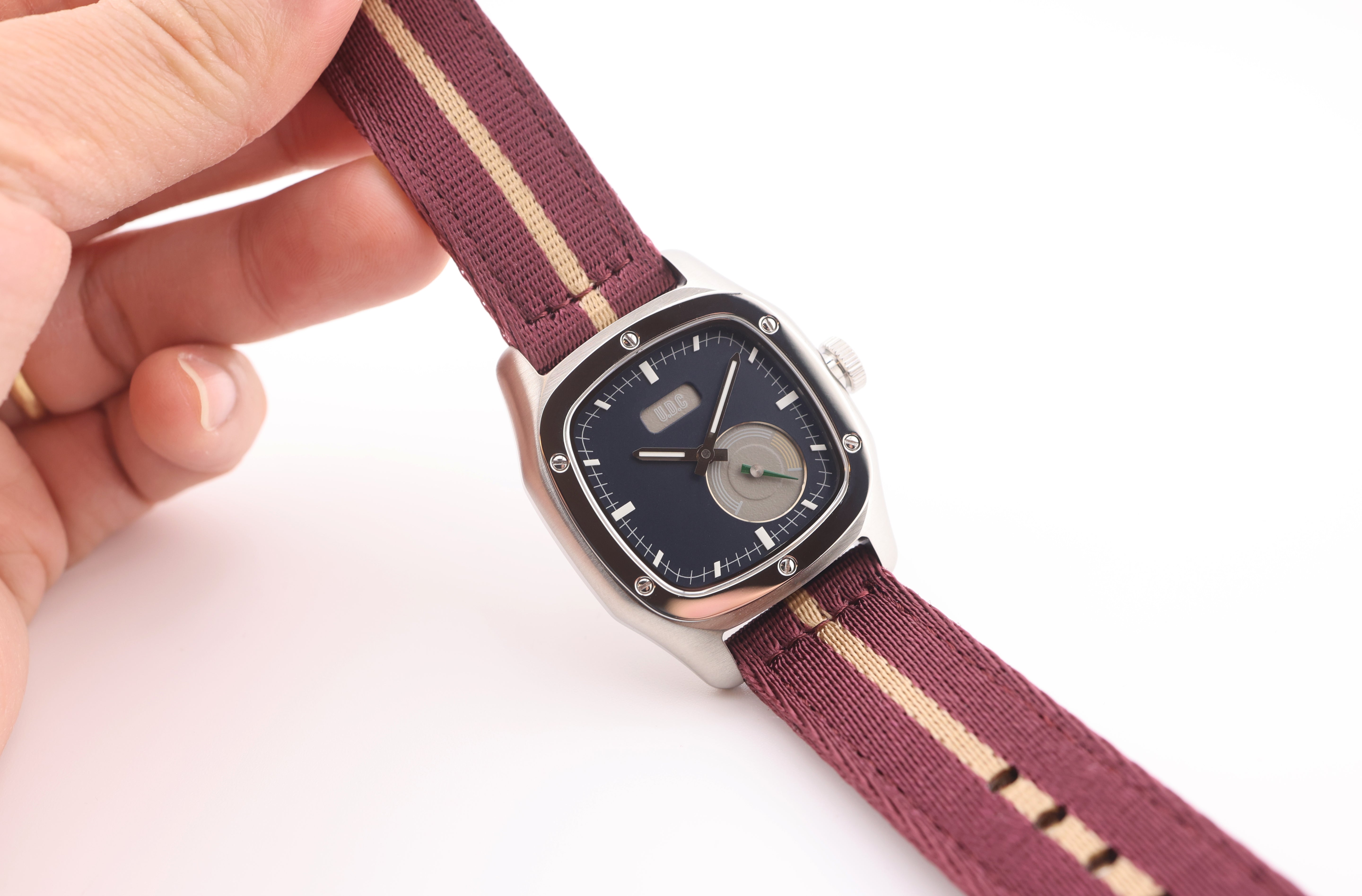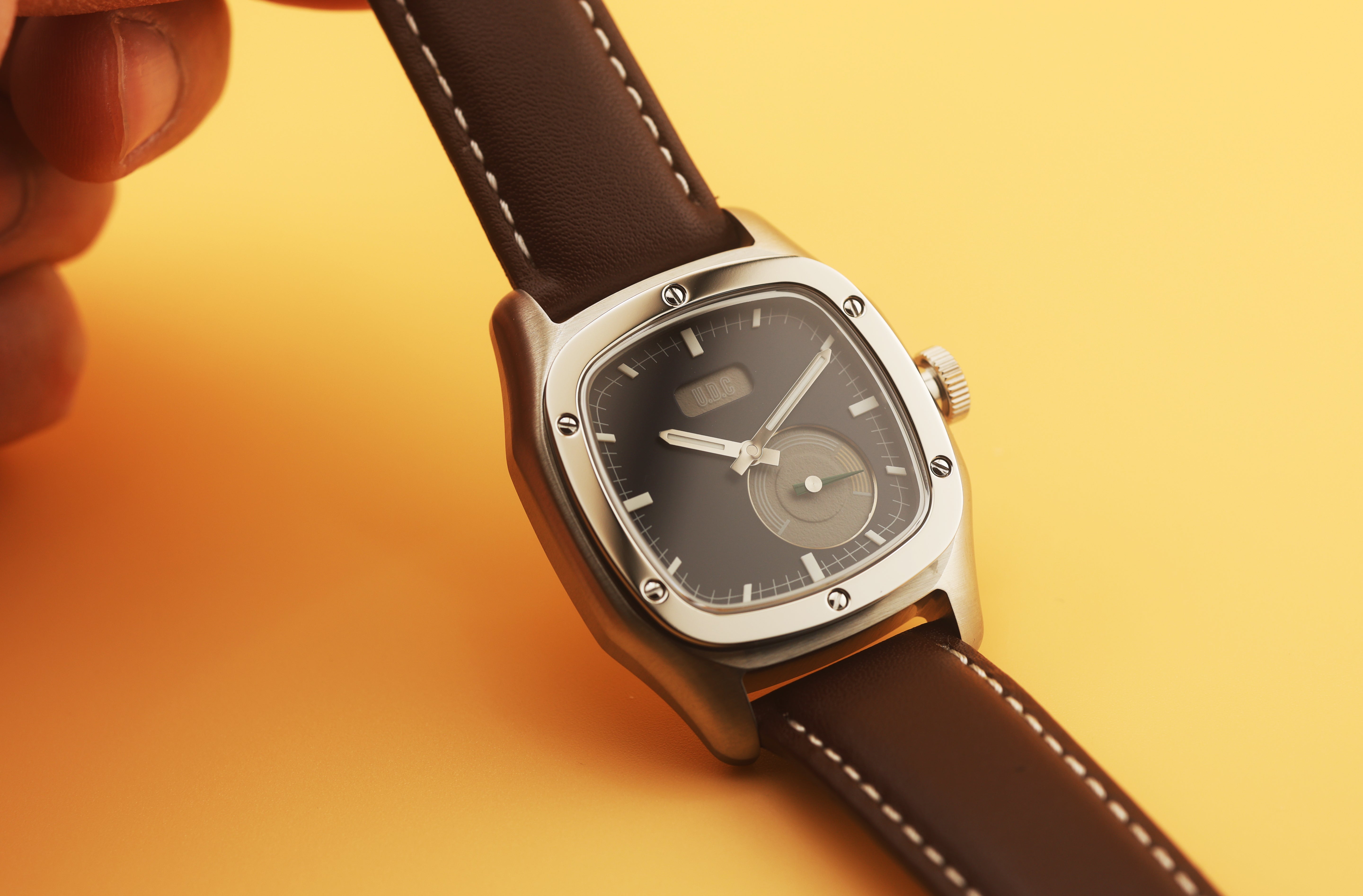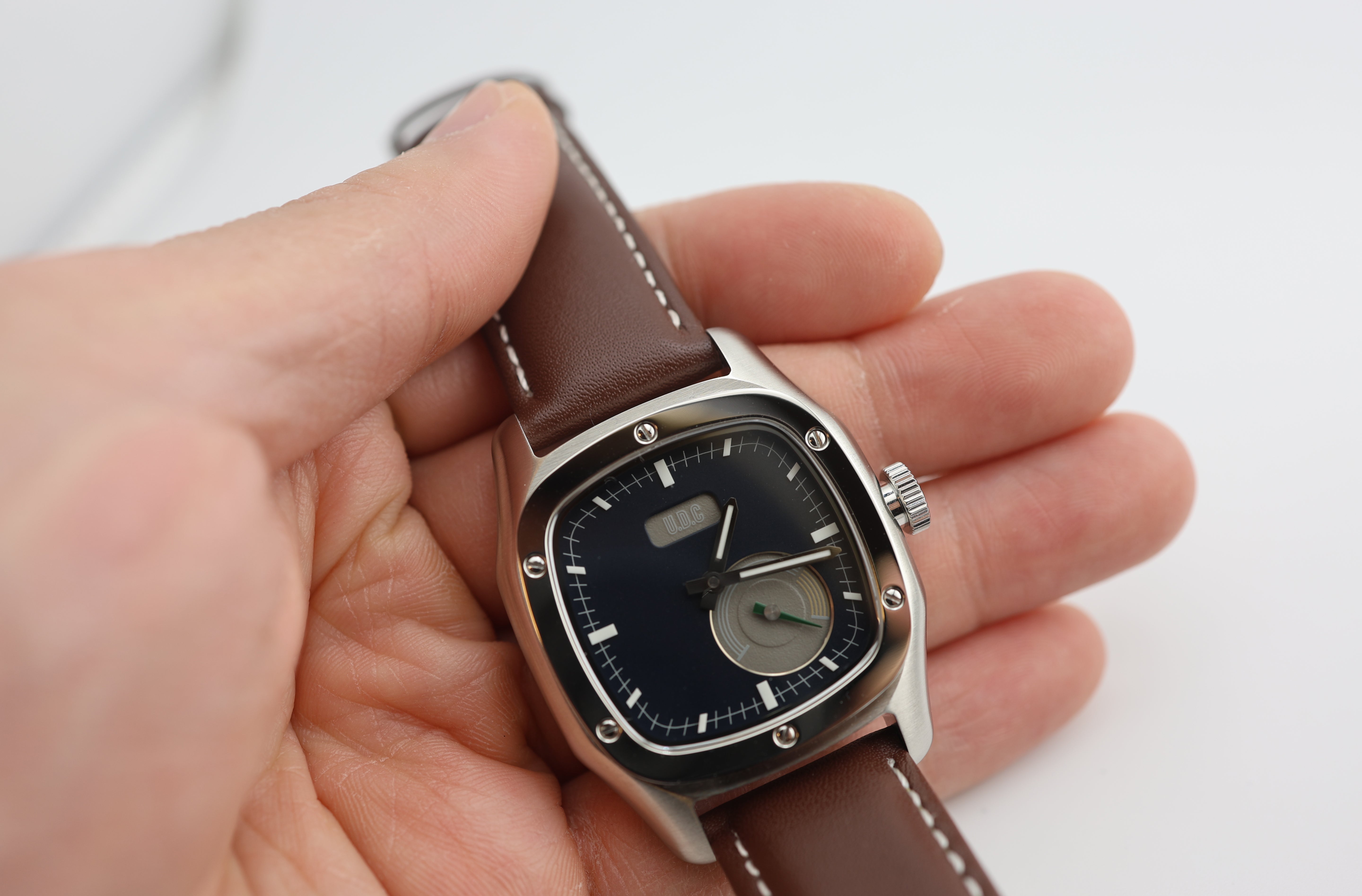 Our watch features a small sub-dial with running second hands. We specifically designed the watch with the sub-dial to resemble a classic car cluster with all their gauges. The small second sub-dial is modeled after a tachometer with a green running hand and yellow "high RPM" range.