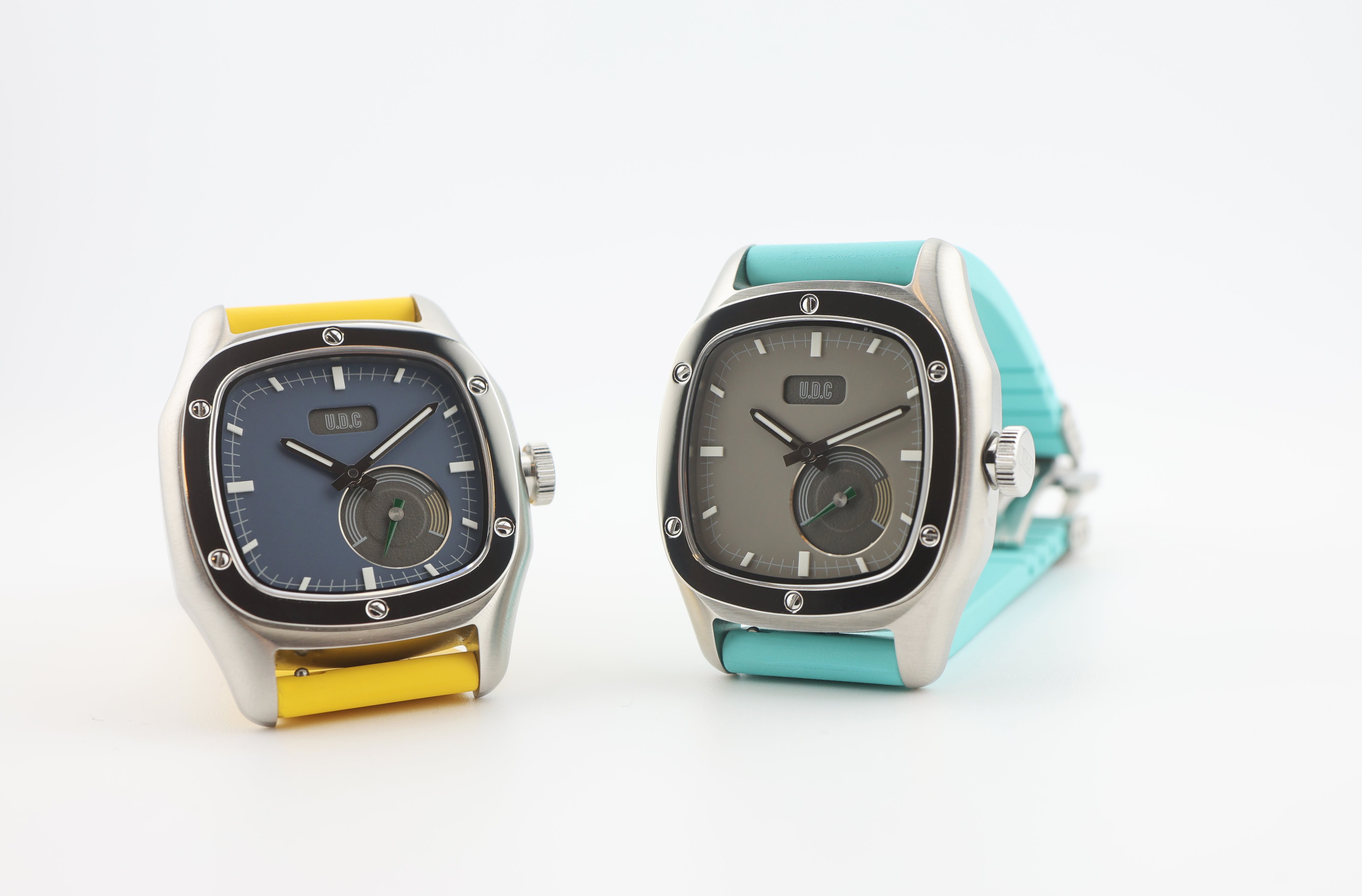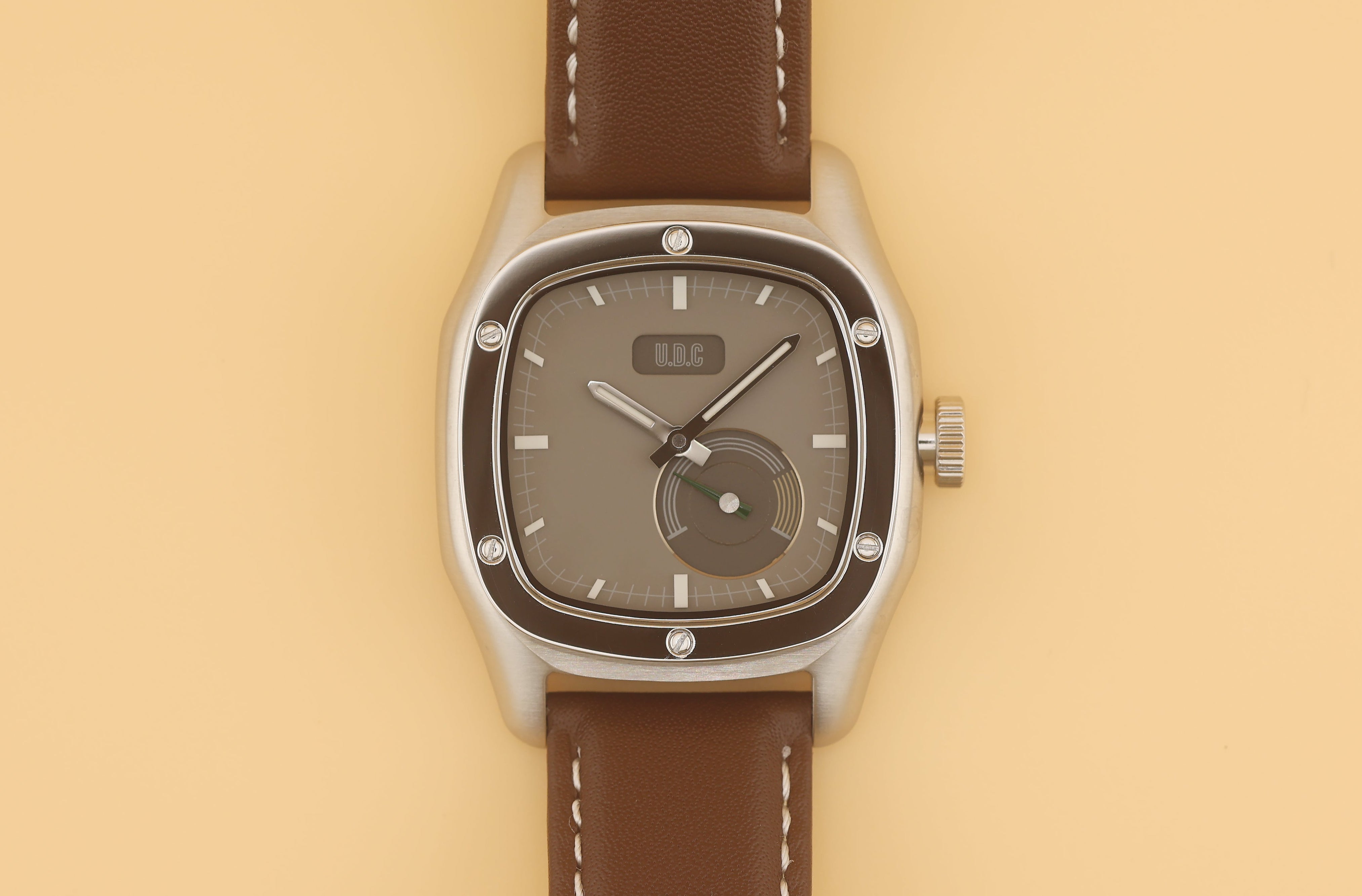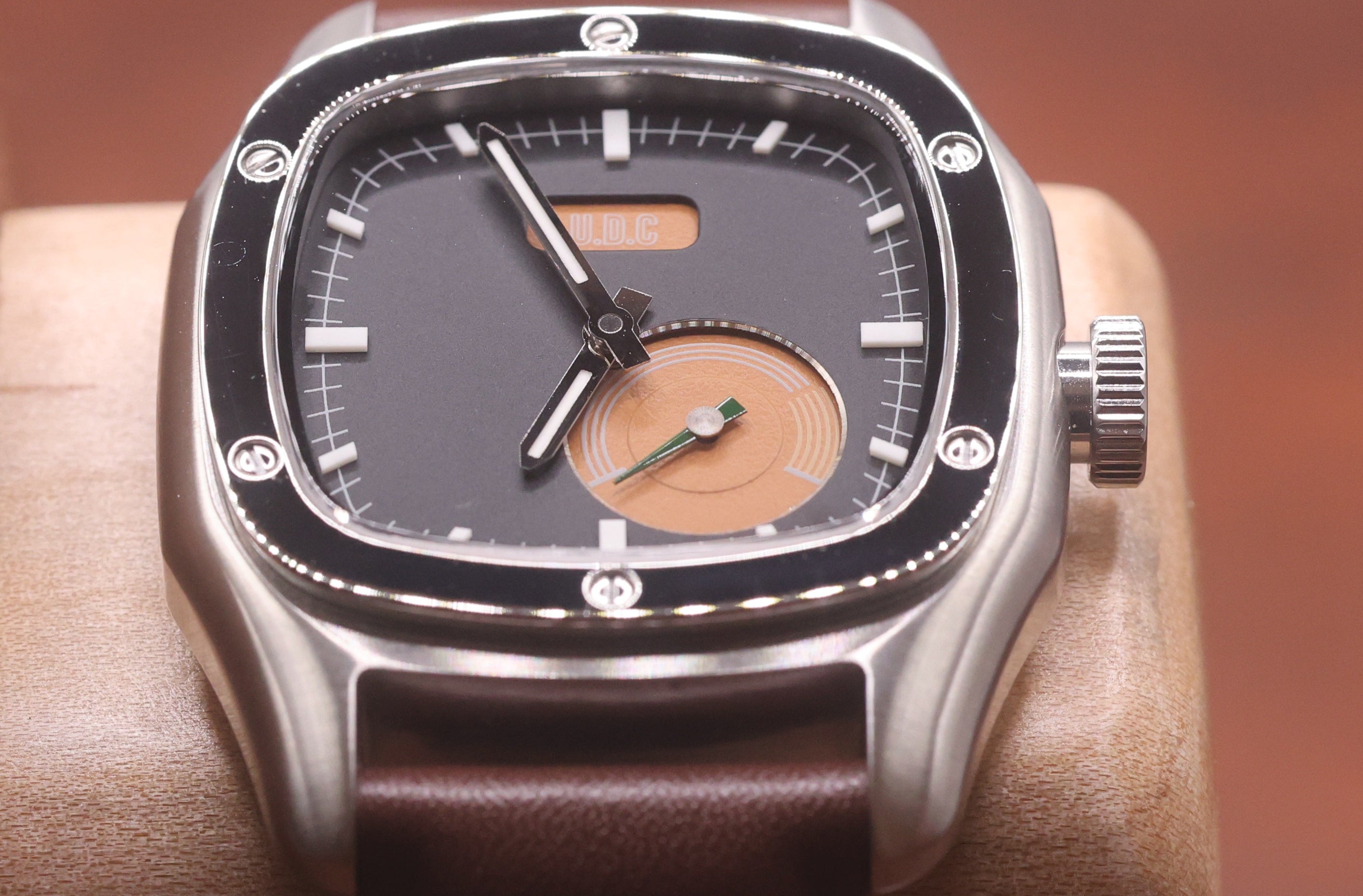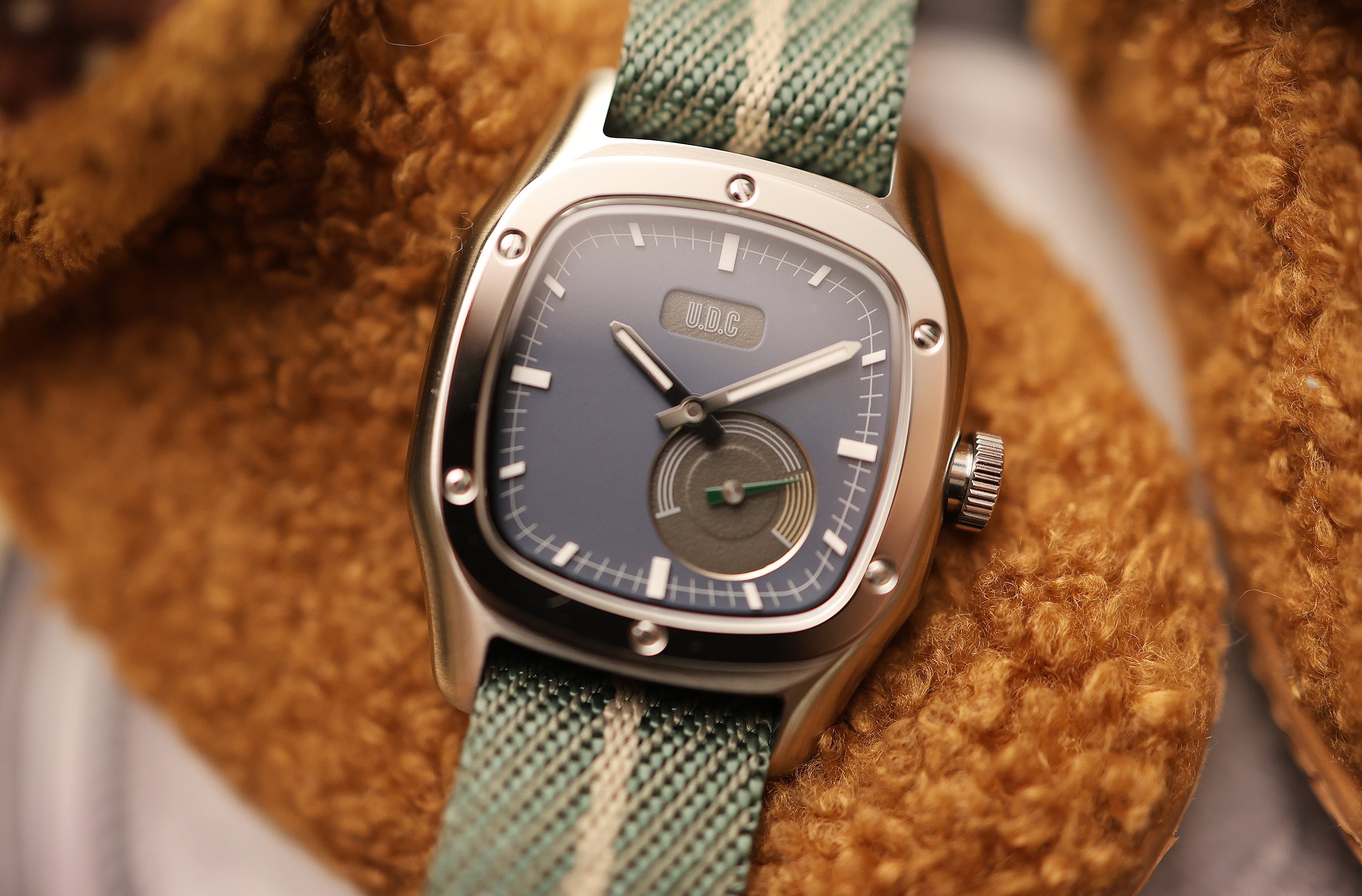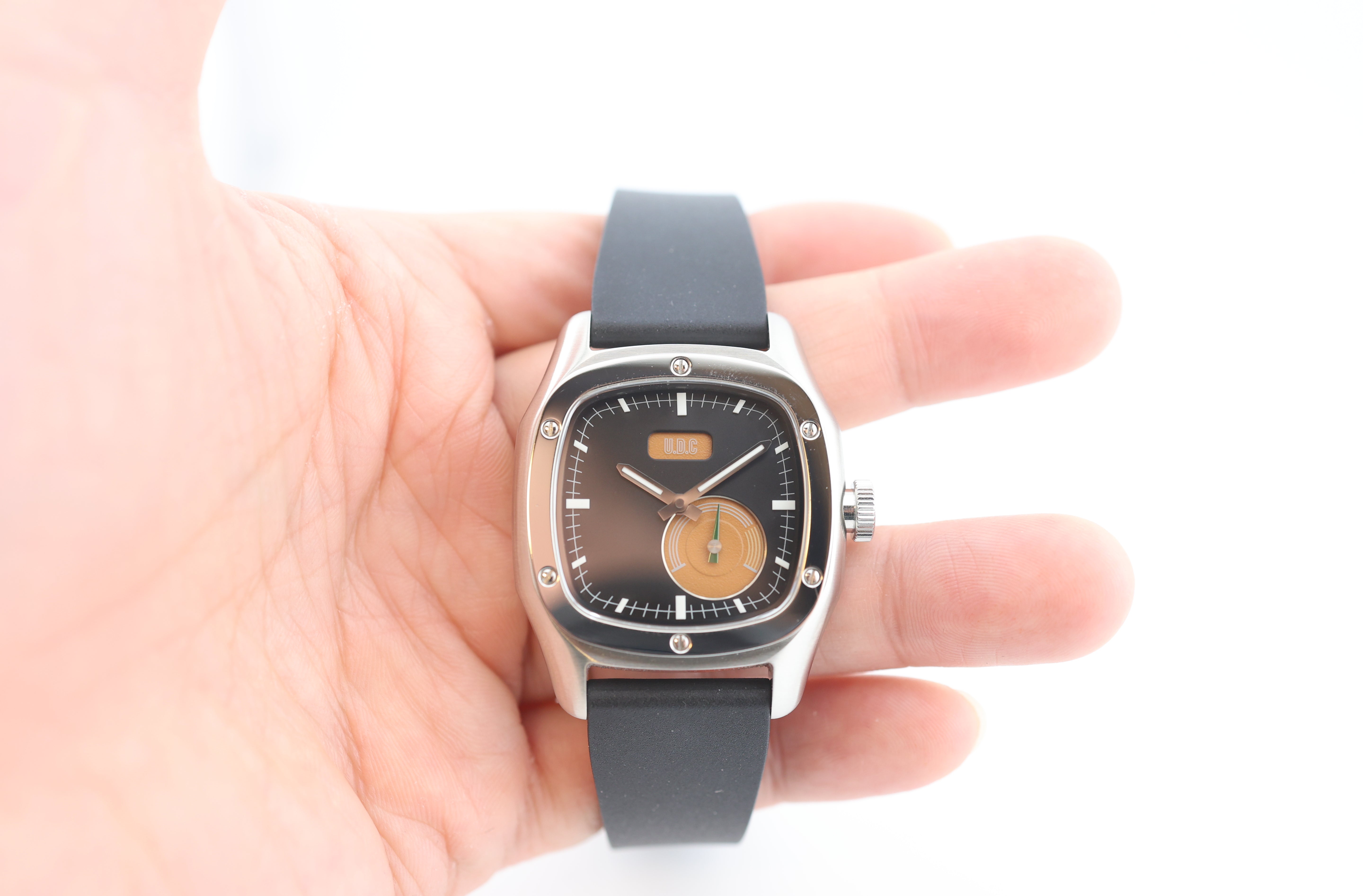 Our watch features a small sub-dial with running second hands. We specifically designed the watch with the sub-dial to resemble a classic car cluster with all their gauges. The small second sub-dial is modeled after a tachometer with a green running hand and yellow "high RPM" range.