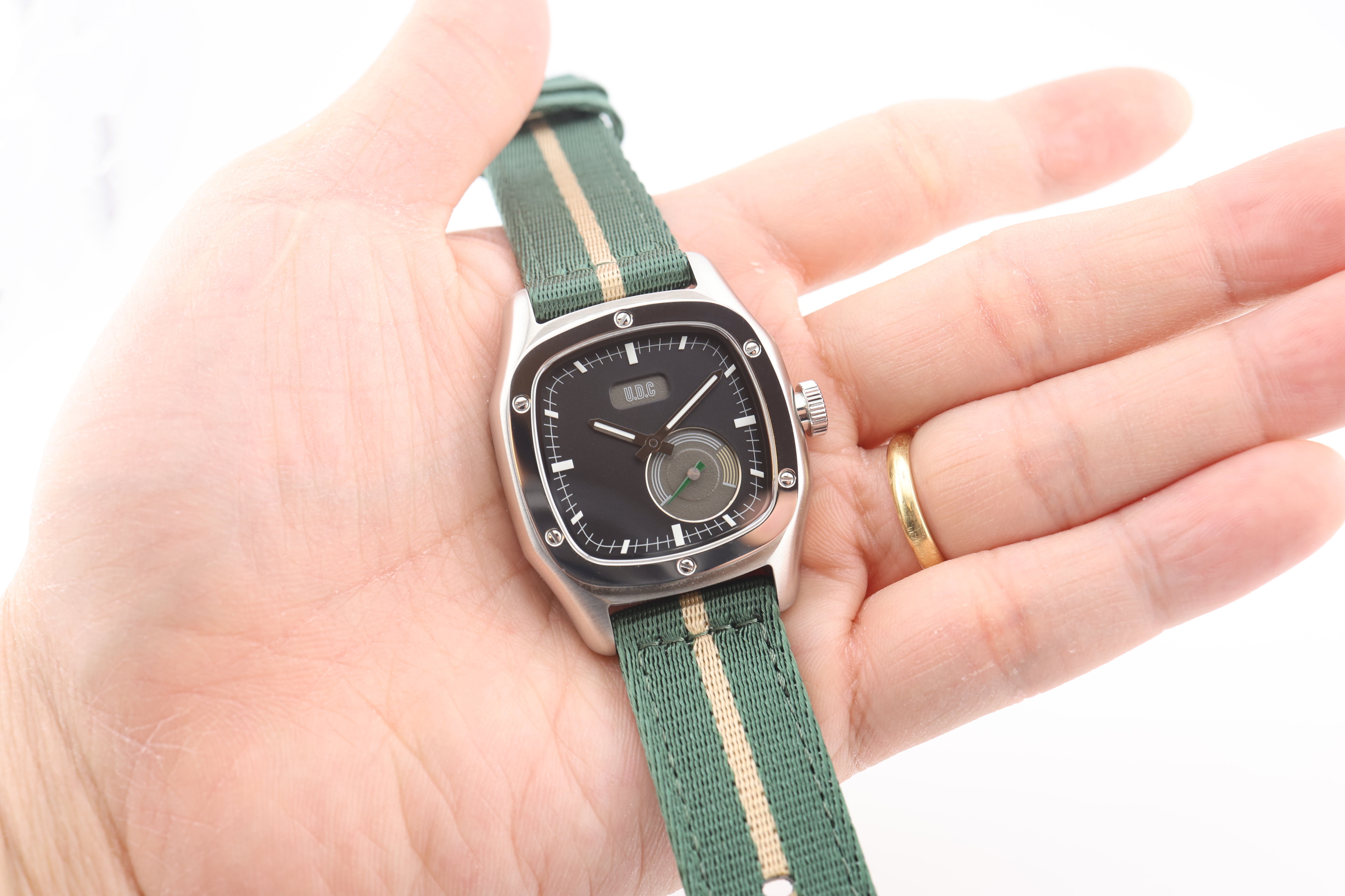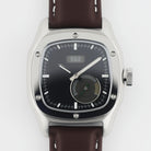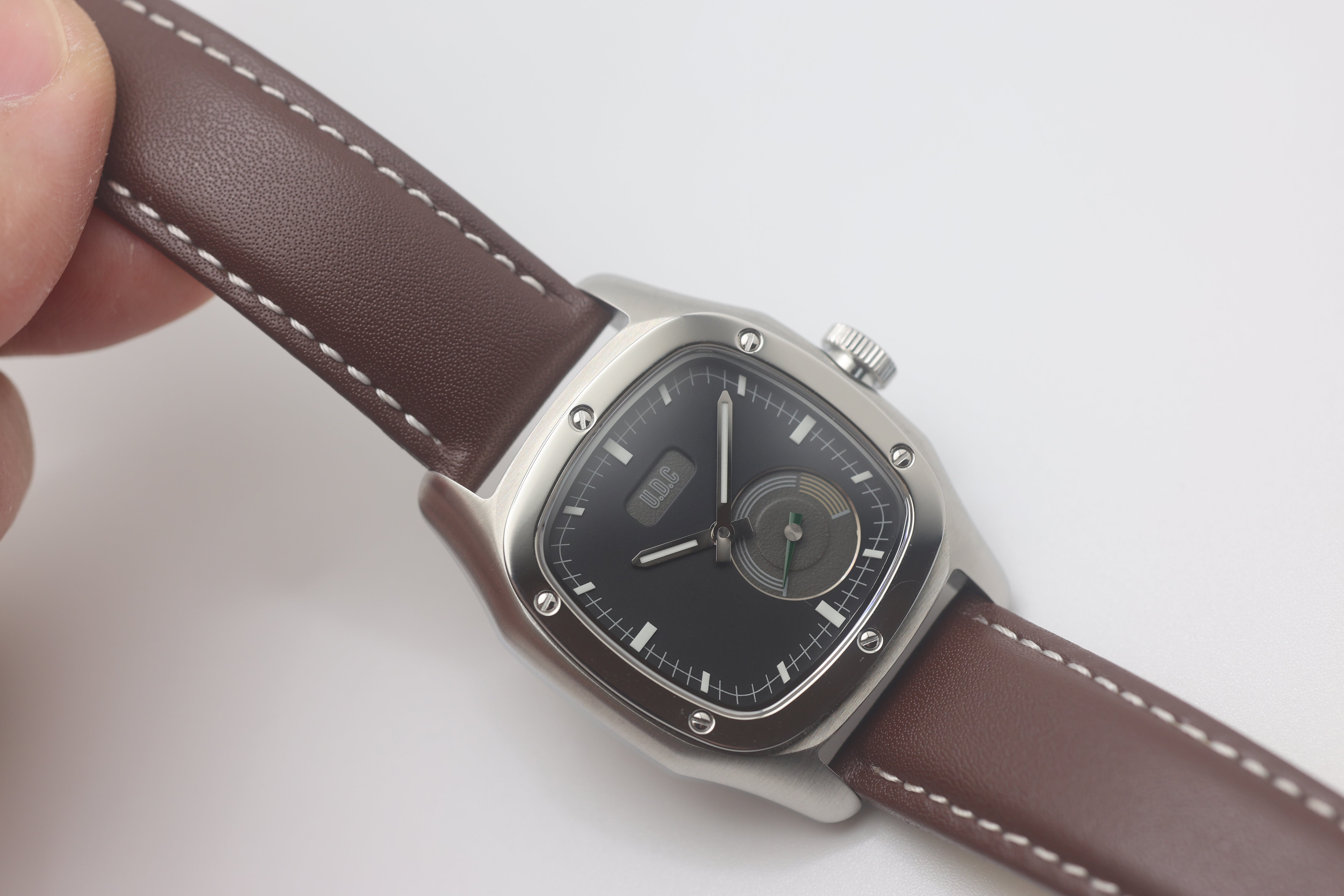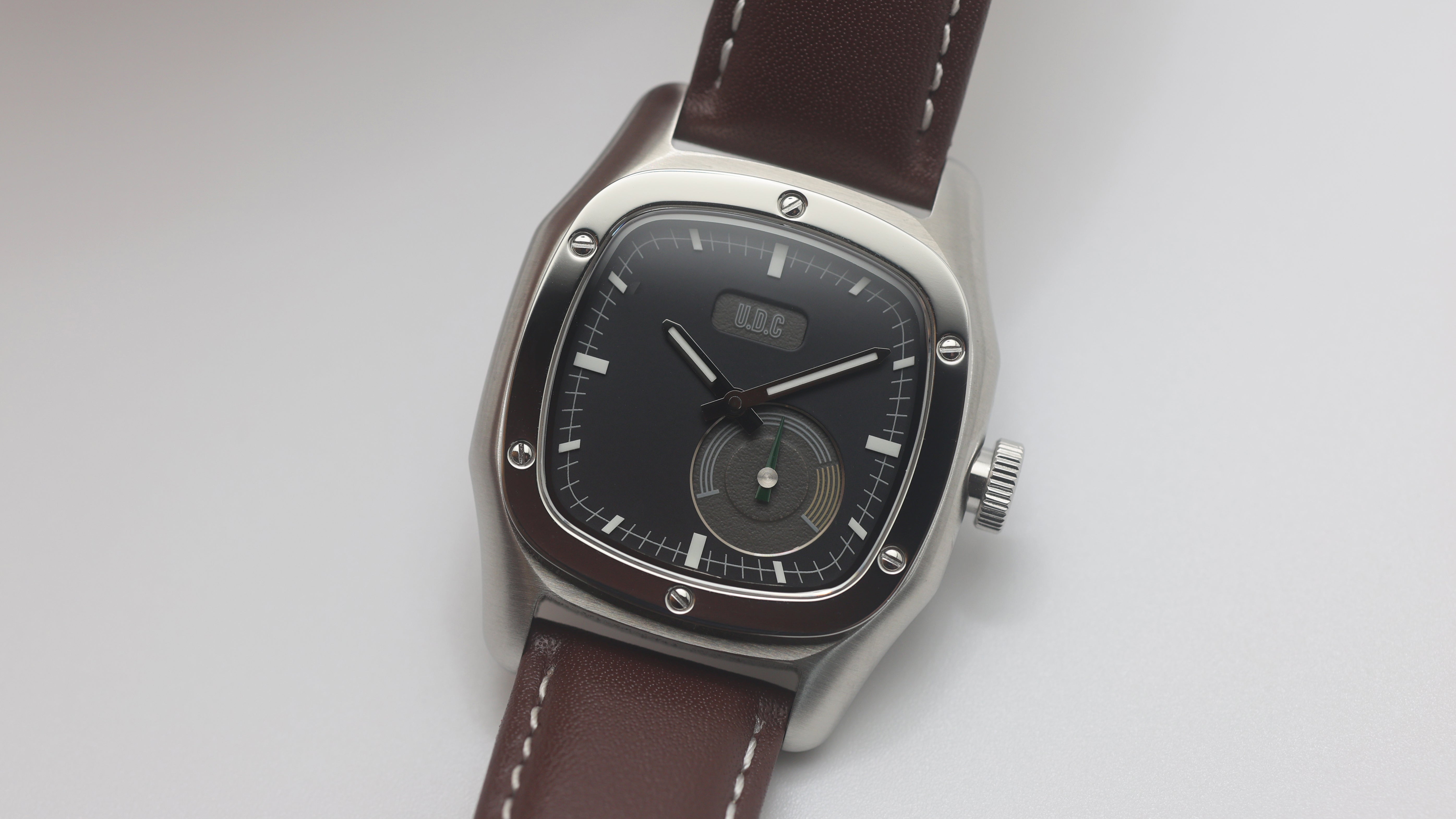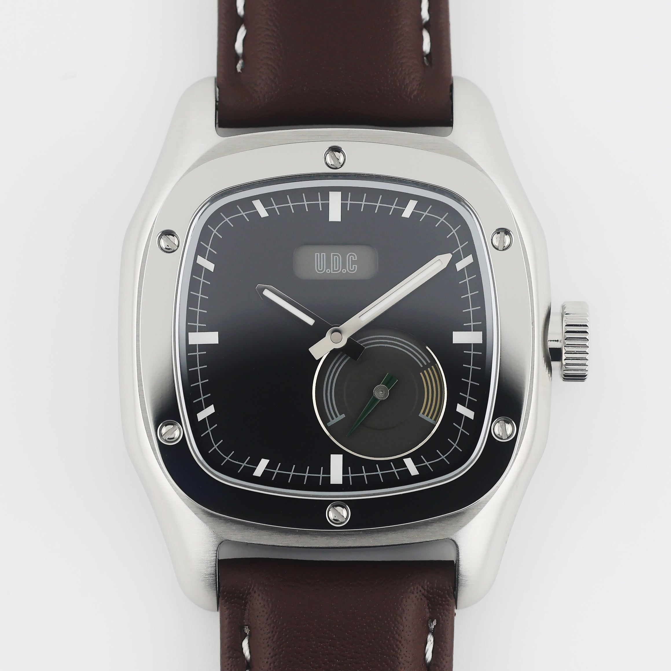 Our watch features a small sub-dial with running second hands. We specifically designed the watch with the sub-dial to resemble a classic car cluster with all their gauges. The small second sub-dial is modeled after a tachometer with a green running hand and yellow "high RPM" range.
