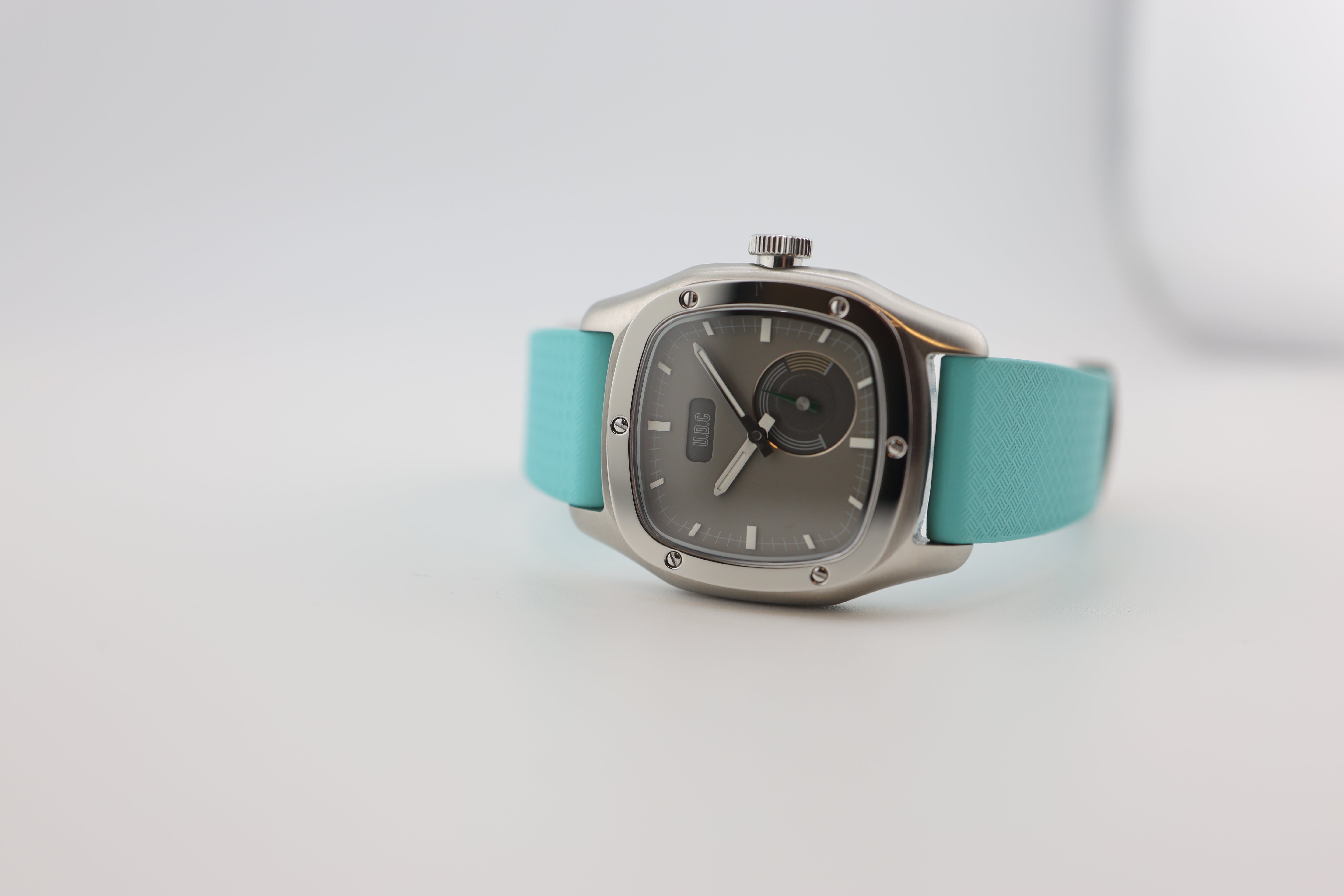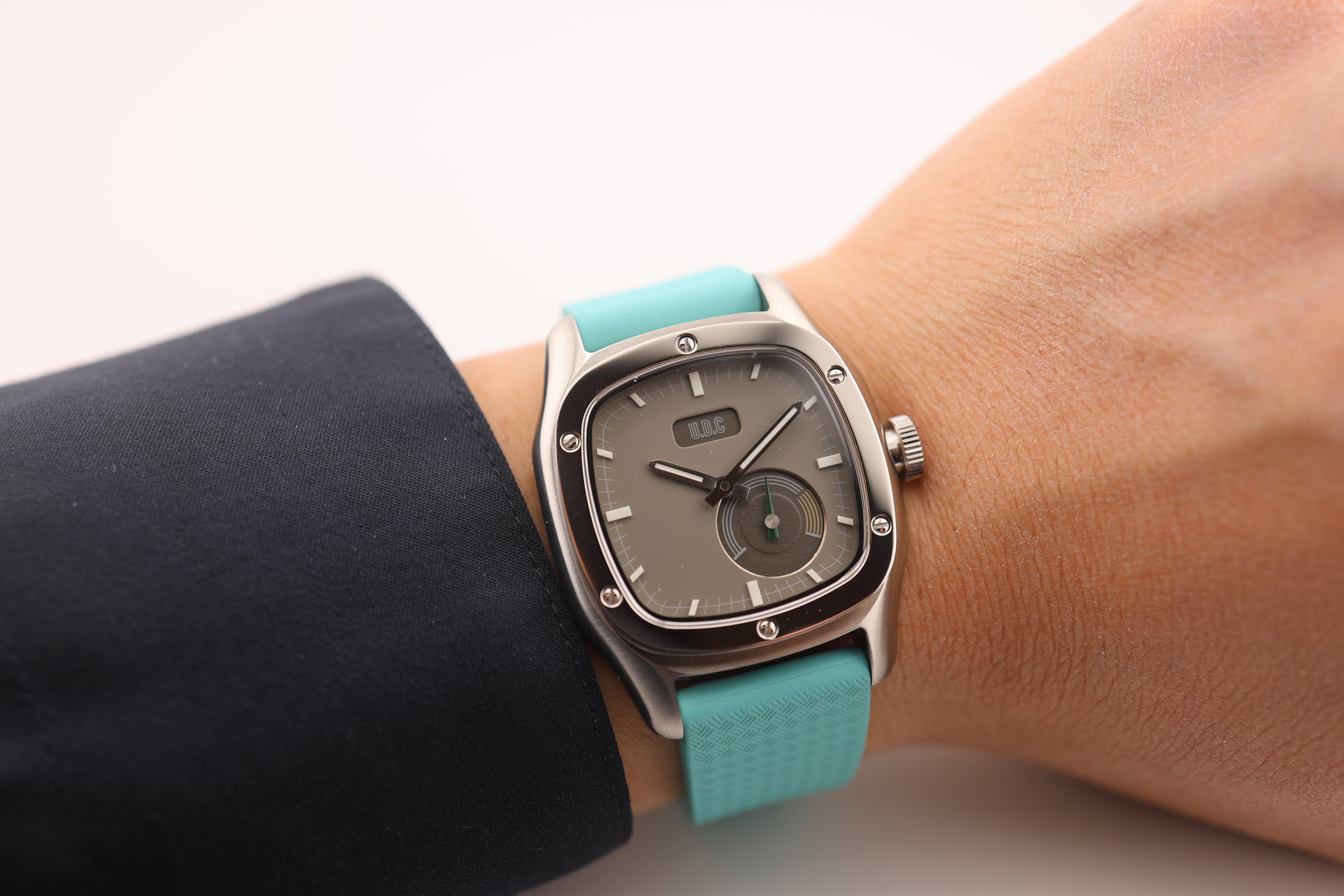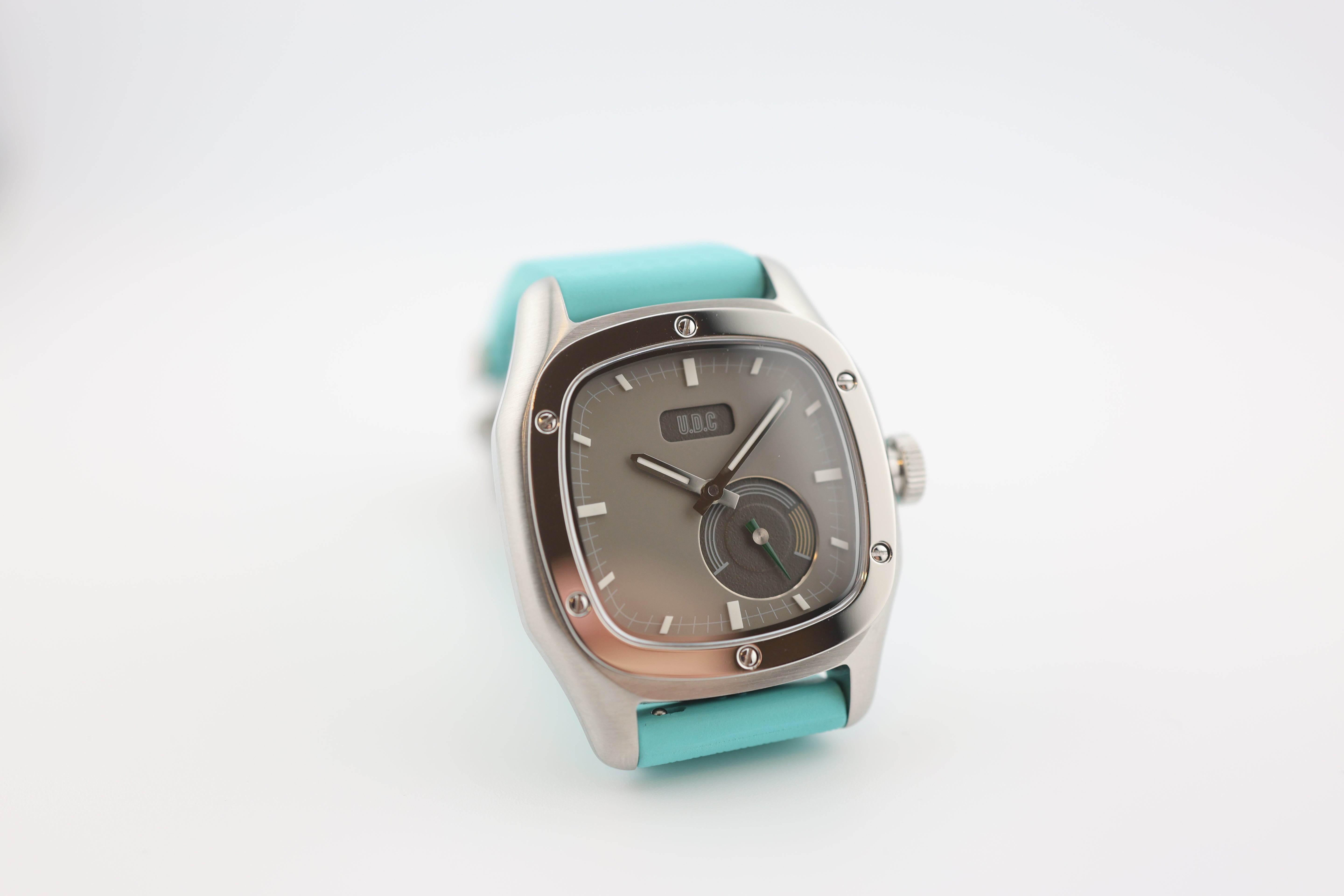 Our watch features a small sub-dial with running second hands. We specifically designed the watch with the sub-dial to resemble a classic car cluster with all their gauges. The small second sub-dial is modeled after a tachometer with a green running hand and yellow "high RPM" range.