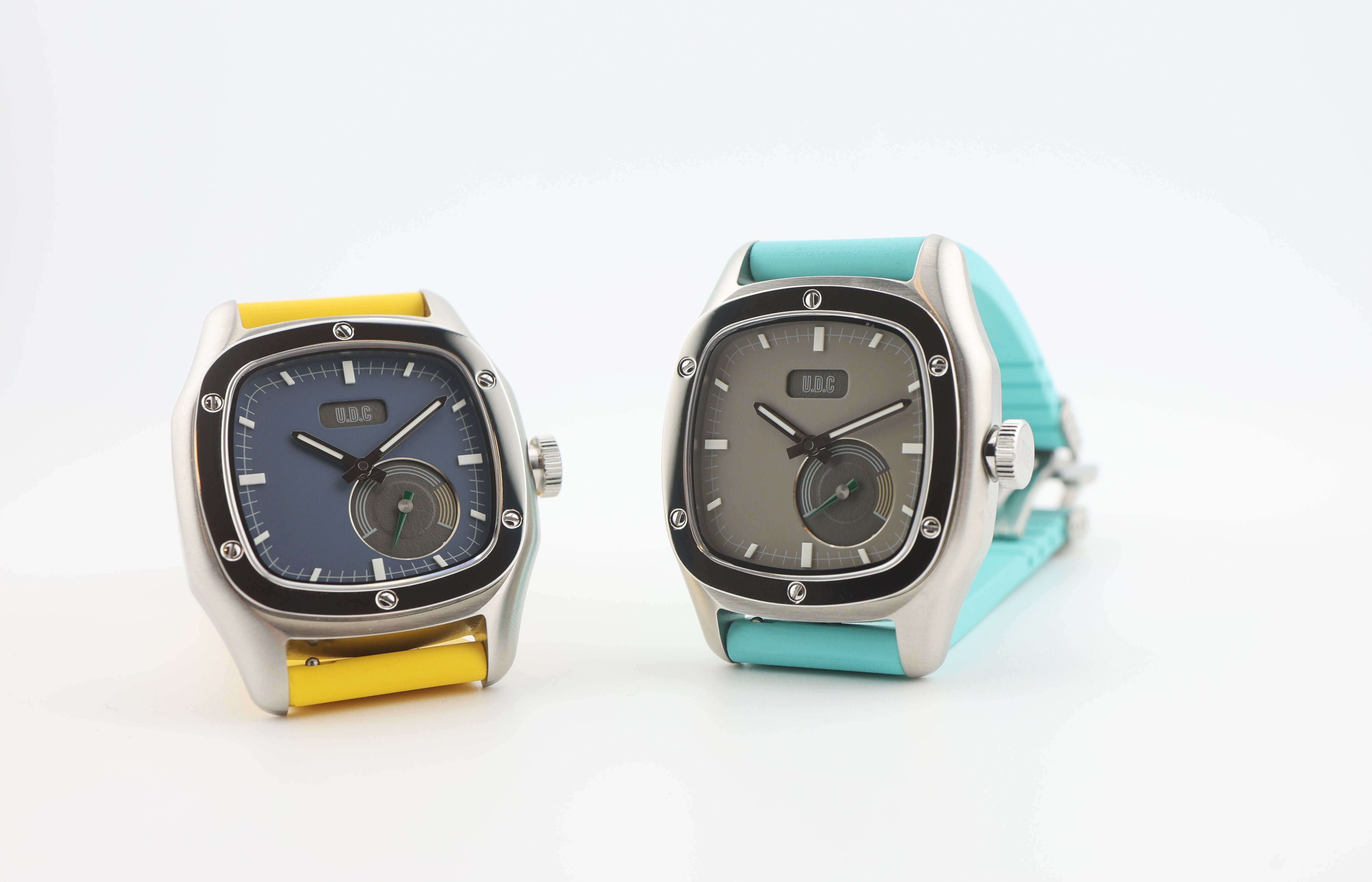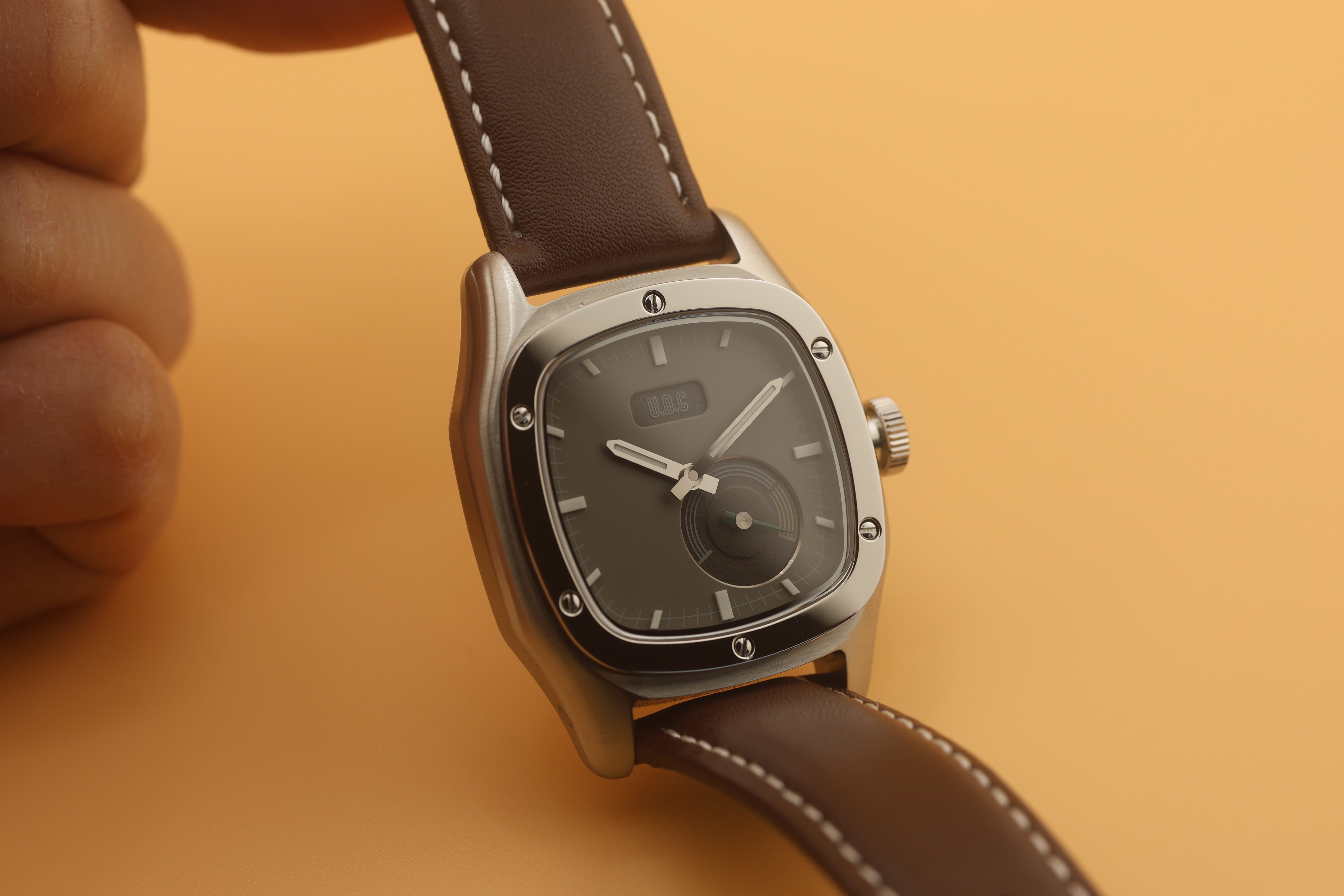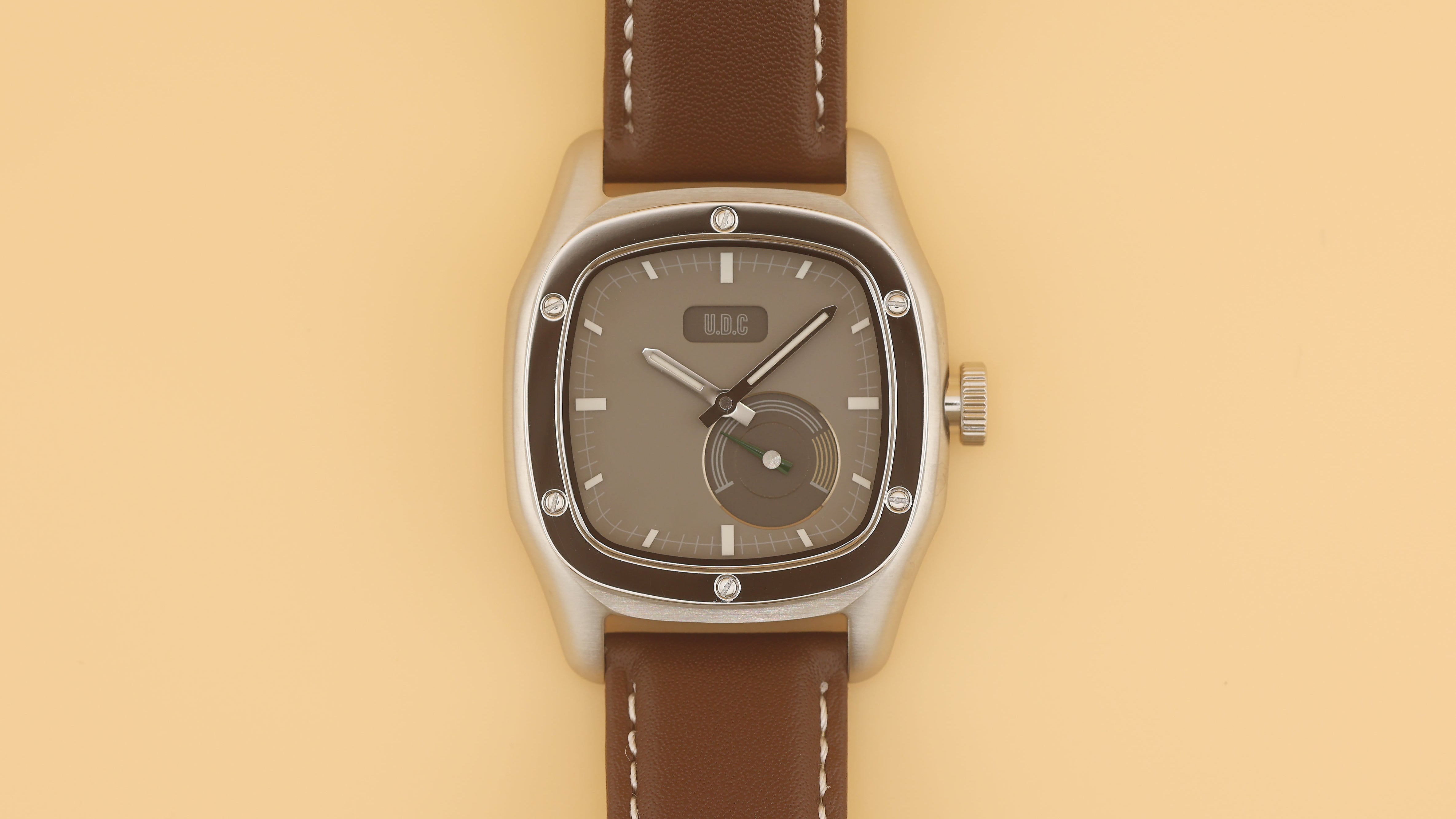 Our watch features a small sub-dial with running second hands. We specifically designed the watch with the sub-dial to resemble a classic car cluster with all their gauges. The small second sub-dial is modeled after a tachometer with a green running hand and yellow "high RPM" range.