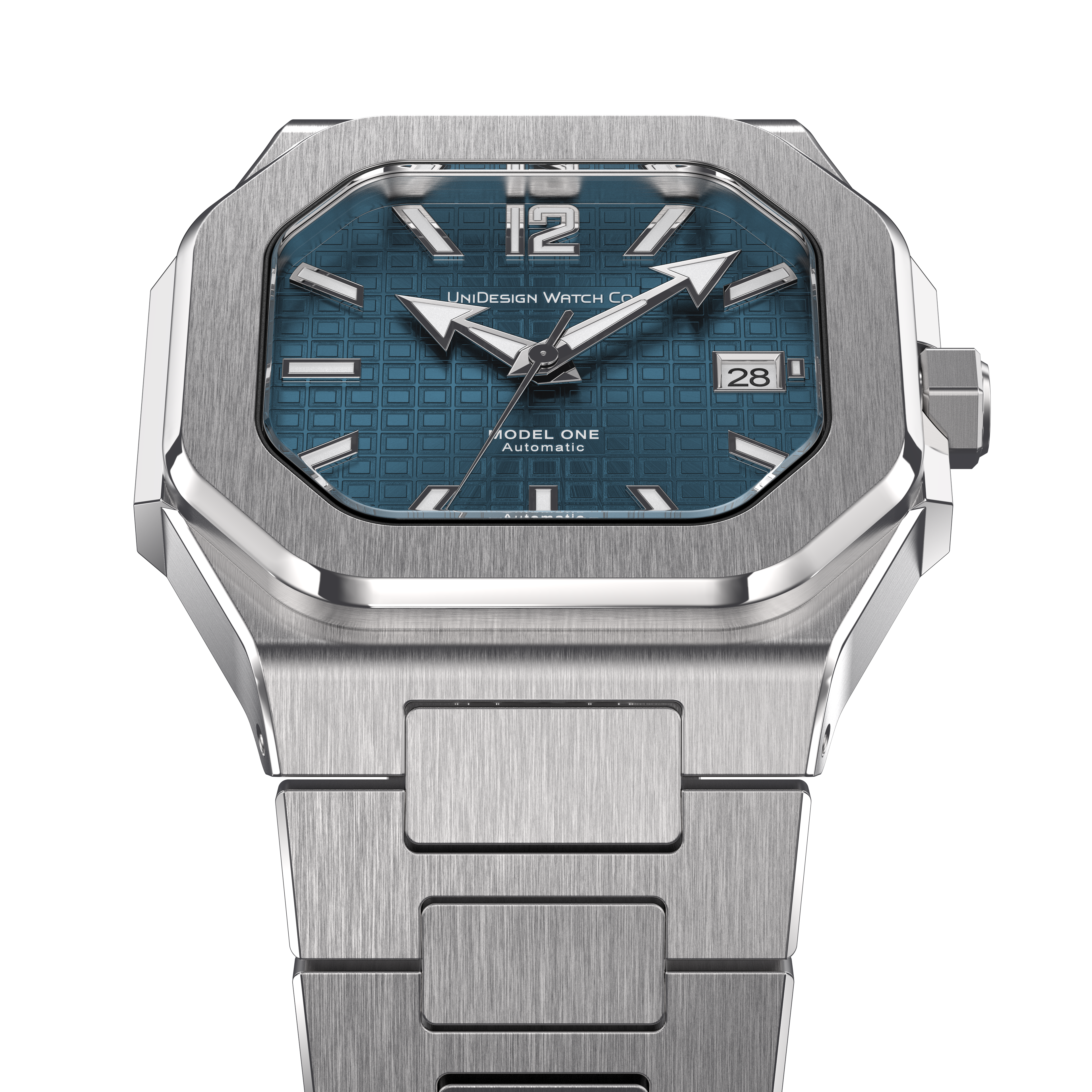 We believe our watch is the very first integrated bracelet watch with a square case shape. Its case shape is what we called "beveled square". We soften the edges of the square to ensure aesthetic quality and reduce the watch's overall foot print